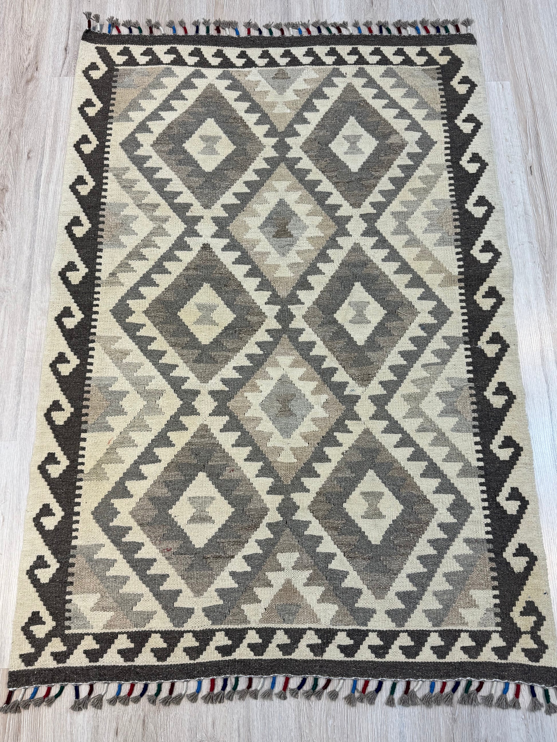 Rooted in the visual language of ancient looms and desert horizons, this kilim rug features a bold geometric pattern that speaks of balance, protection, and movement. Angular motifs—diamonds, hooks, and stepped lines—unfold with rhythmic precision across a flatwoven field.