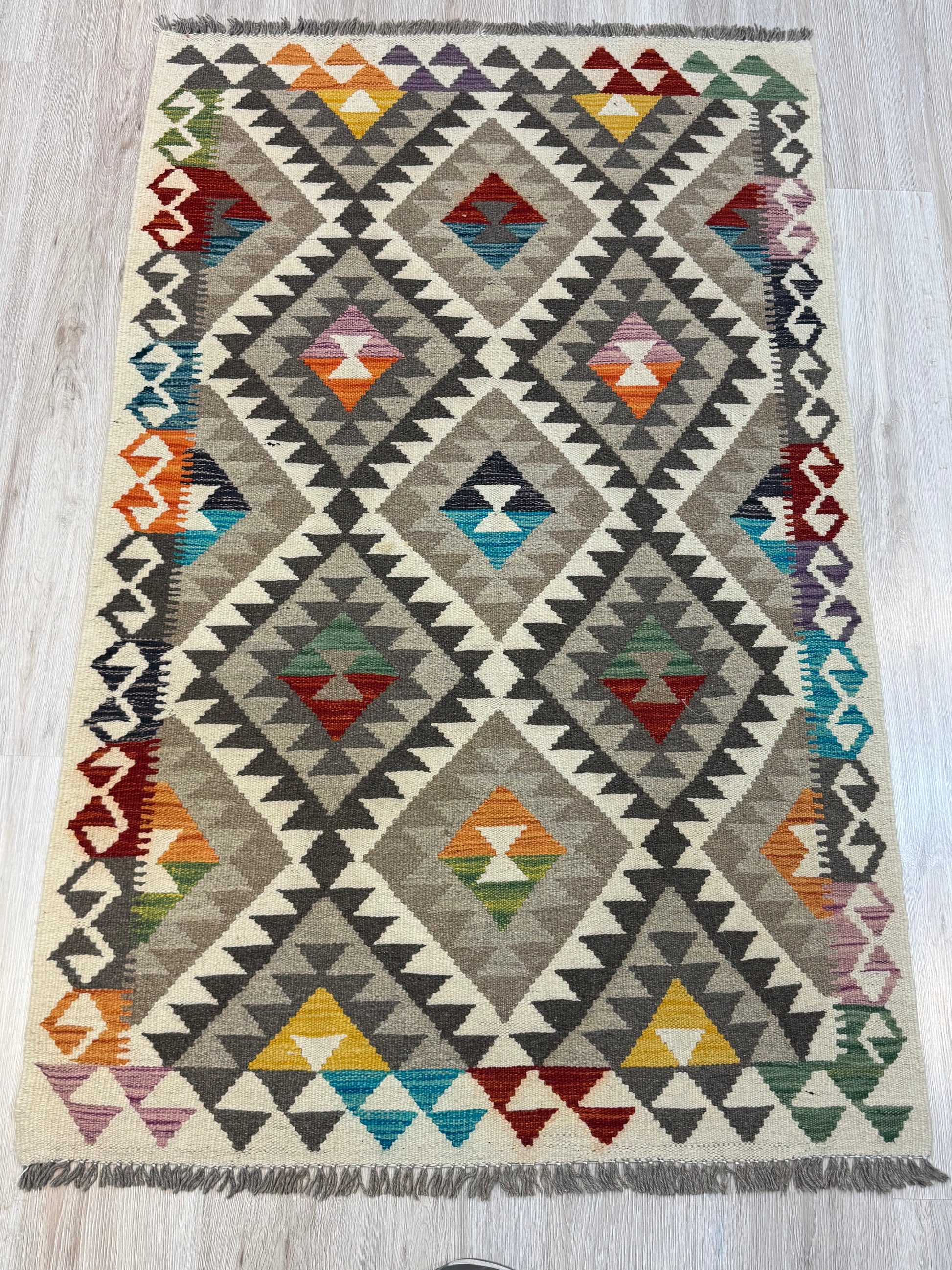 Echoing the ancestral rhythms of nomadic craftsmanship, this kilim rug unveils a vivid geometric pattern where every line and angle tells a story of movement, memory, and meaning. Its motifs—sharp diamonds, zigzags, and stepped edges—unfold with purposeful symmetry.
