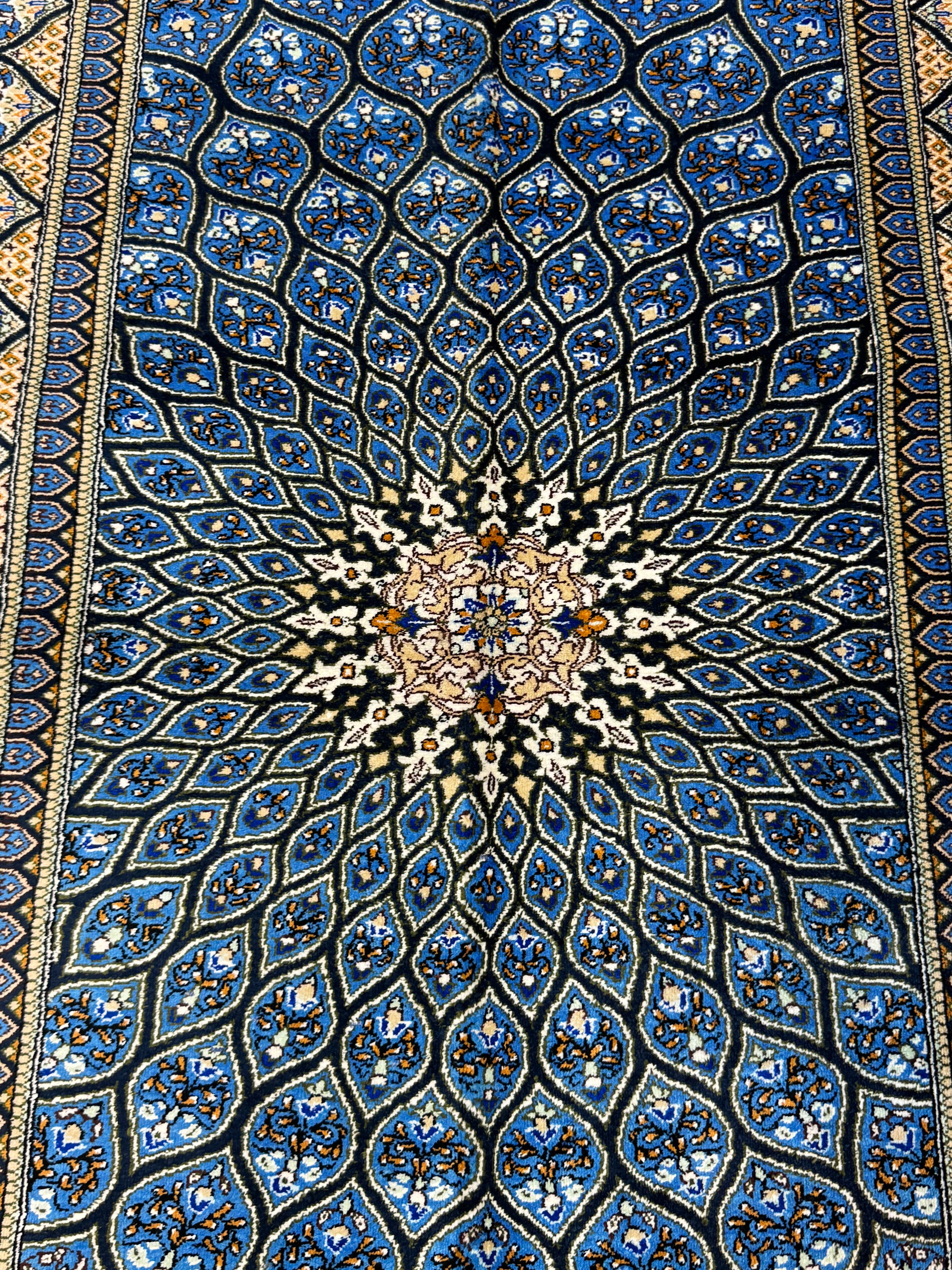 Drawing from the sublime architecture of starlit domes, this silk rug unfolds like a celestial map rendered in thread. Its harmonious design radiates from a glowing central axis, echoing the sacred symmetry of ancient observatories and spiritual halls.