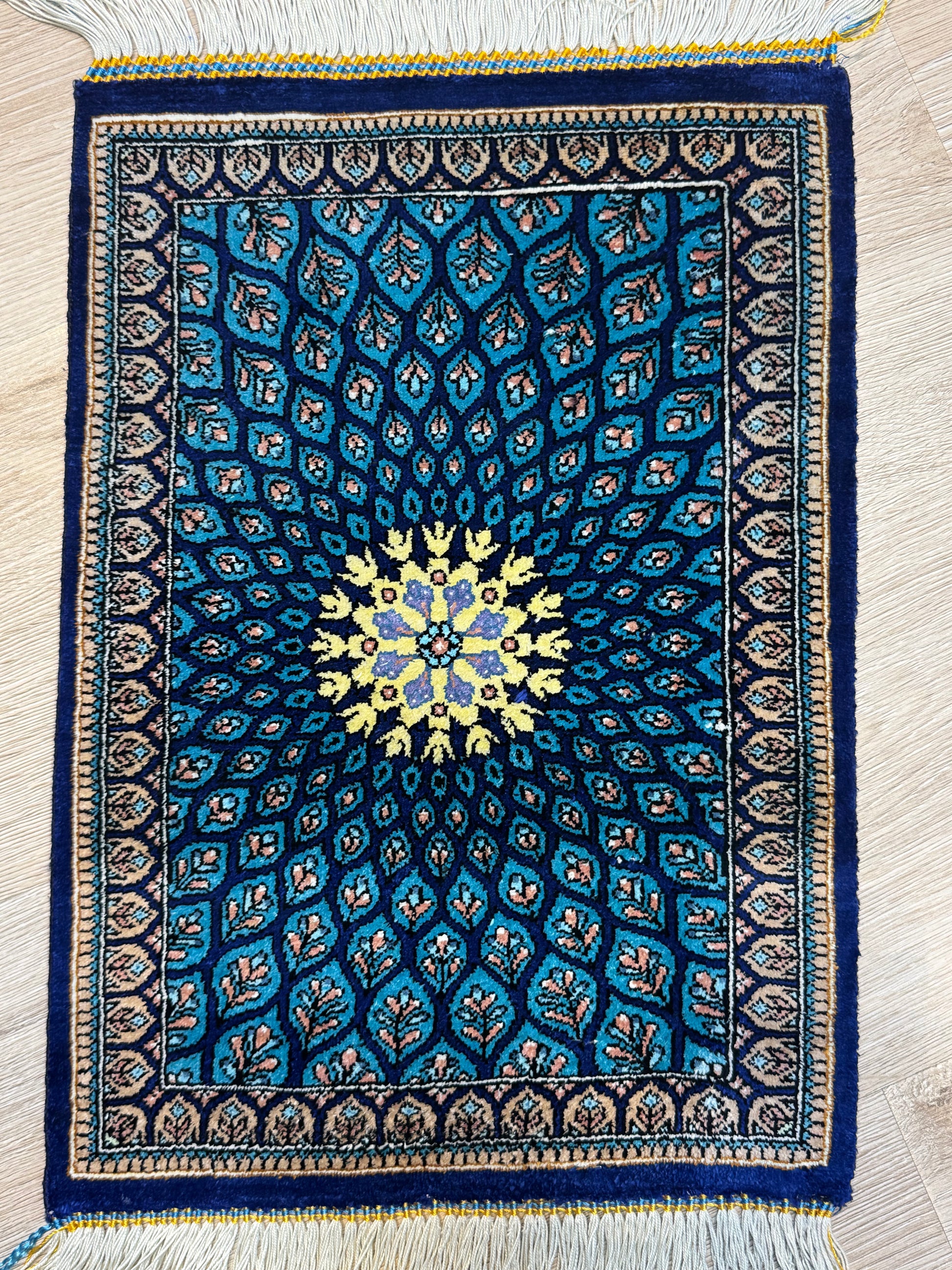 Handwoven from the finest silk and enriched with natural plant-based dyes, the palette of deep sapphire, ivory, and soft gold glows with quiet brilliance. A refined blend of cosmic elegance and artisanal mastery, this piece brings timeless grace and spiritual stillness to any interior.