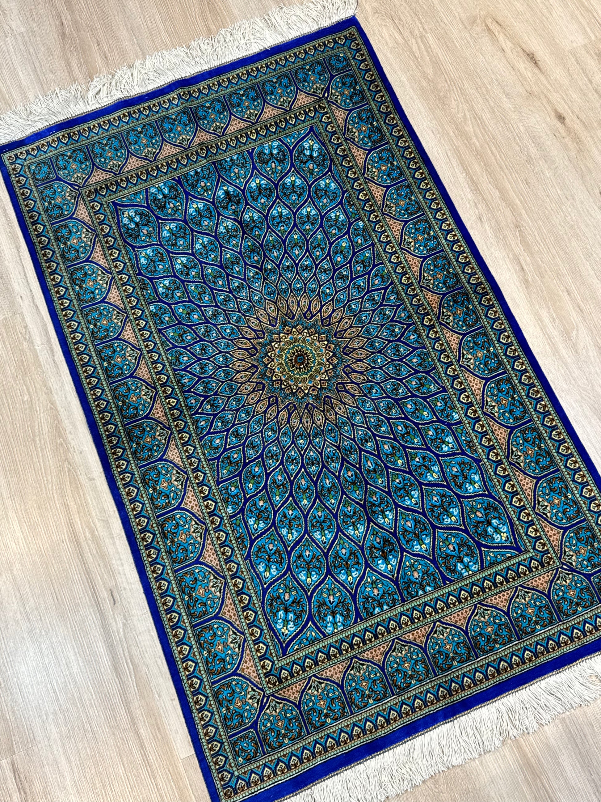 Inspired by the architectural poetry of ancient celestial domes, this silk rug unfolds in radiant symmetry from a luminous center. Its design mirrors the cosmic balance of the night sky, where every line and motif reflects harmony and sacred order.