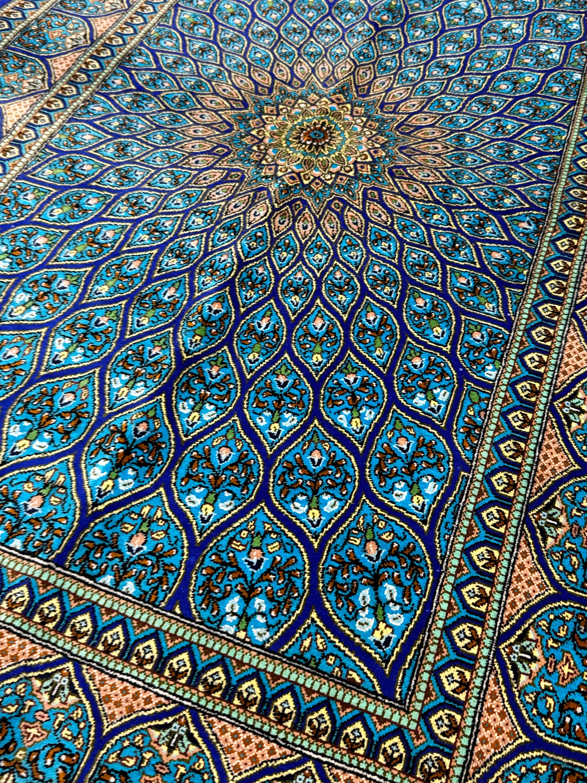 Woven with masterful precision and tinted with natural plant-based dyes, the palette of sapphire, ivory, and soft gold glows with refined depth. A serene tribute to mysticism, artistry, and timeless elegance, this piece brings a quiet sense of wonder to any interior.