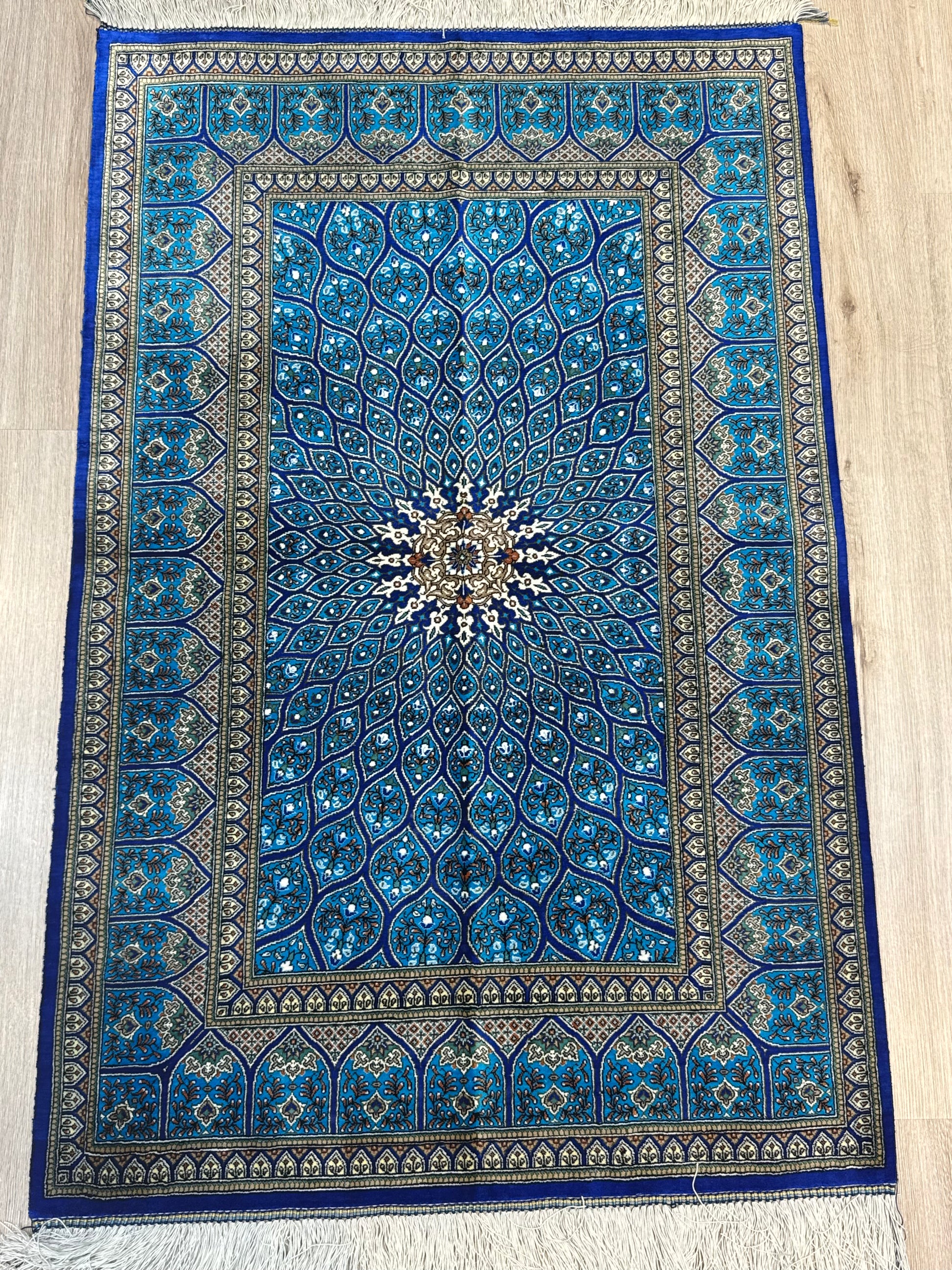 Drawing inspiration from the timeless geometry of sacred domes, this silk rug unfolds like a celestial chart etched in thread. Its radiant medallion anchors a symmetrical composition, echoing the serene order of ancient observatories and spiritual sanctuaries.