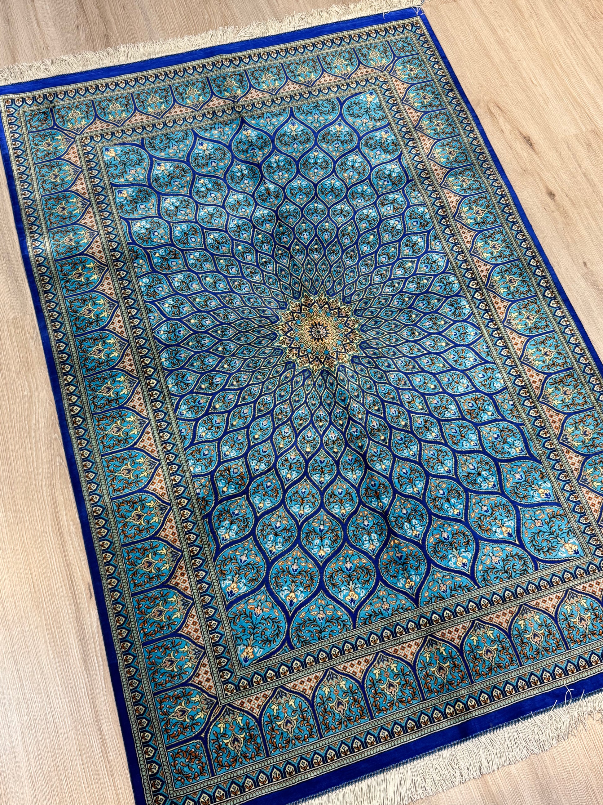 Inspired by the cosmic elegance of starlit architecture, this silk rug mirrors the quiet grandeur of celestial domes. From a luminous heart, its symmetrical design unfolds like constellations in motion, echoing the sacred geometry of ancient skies.