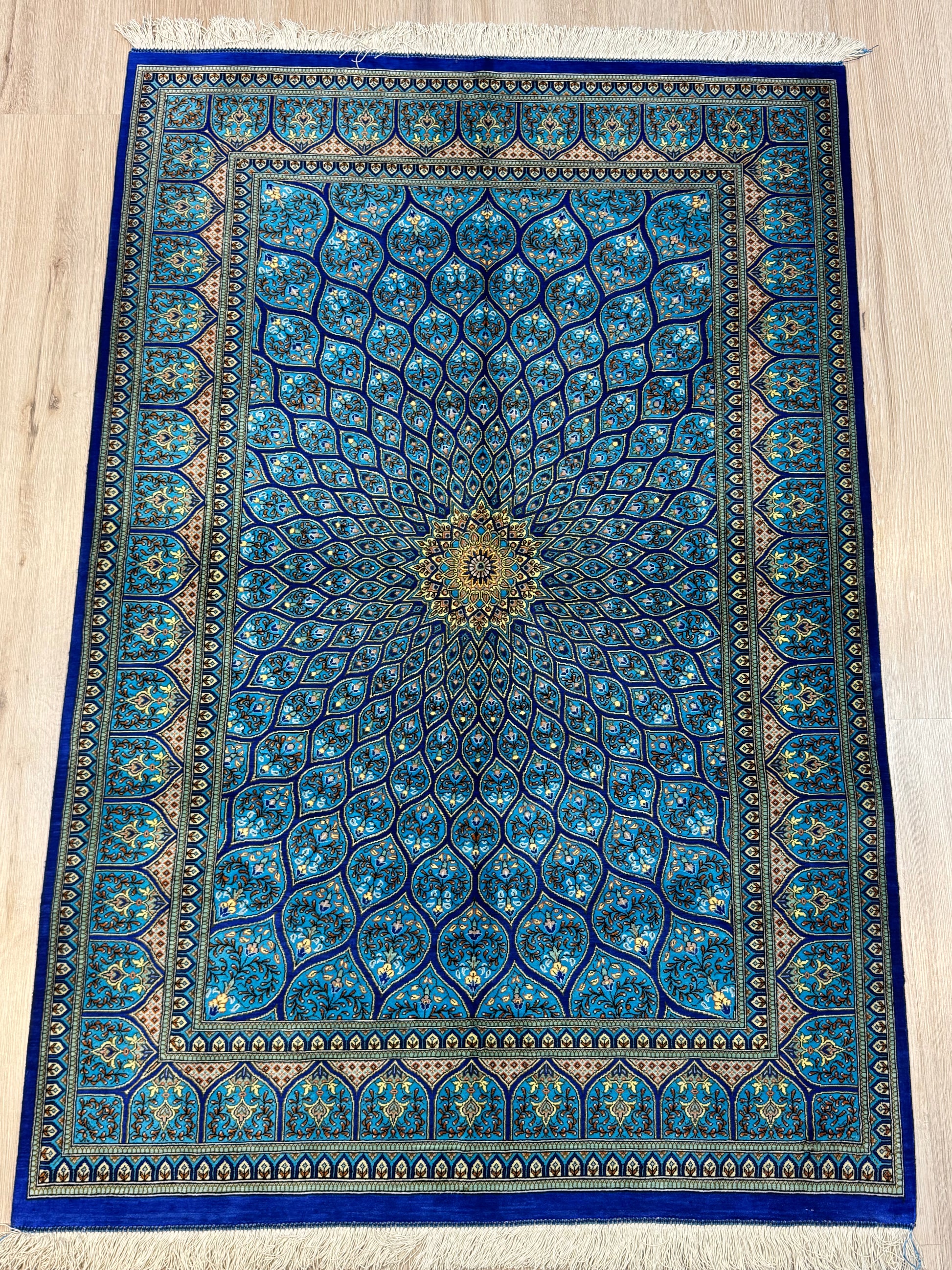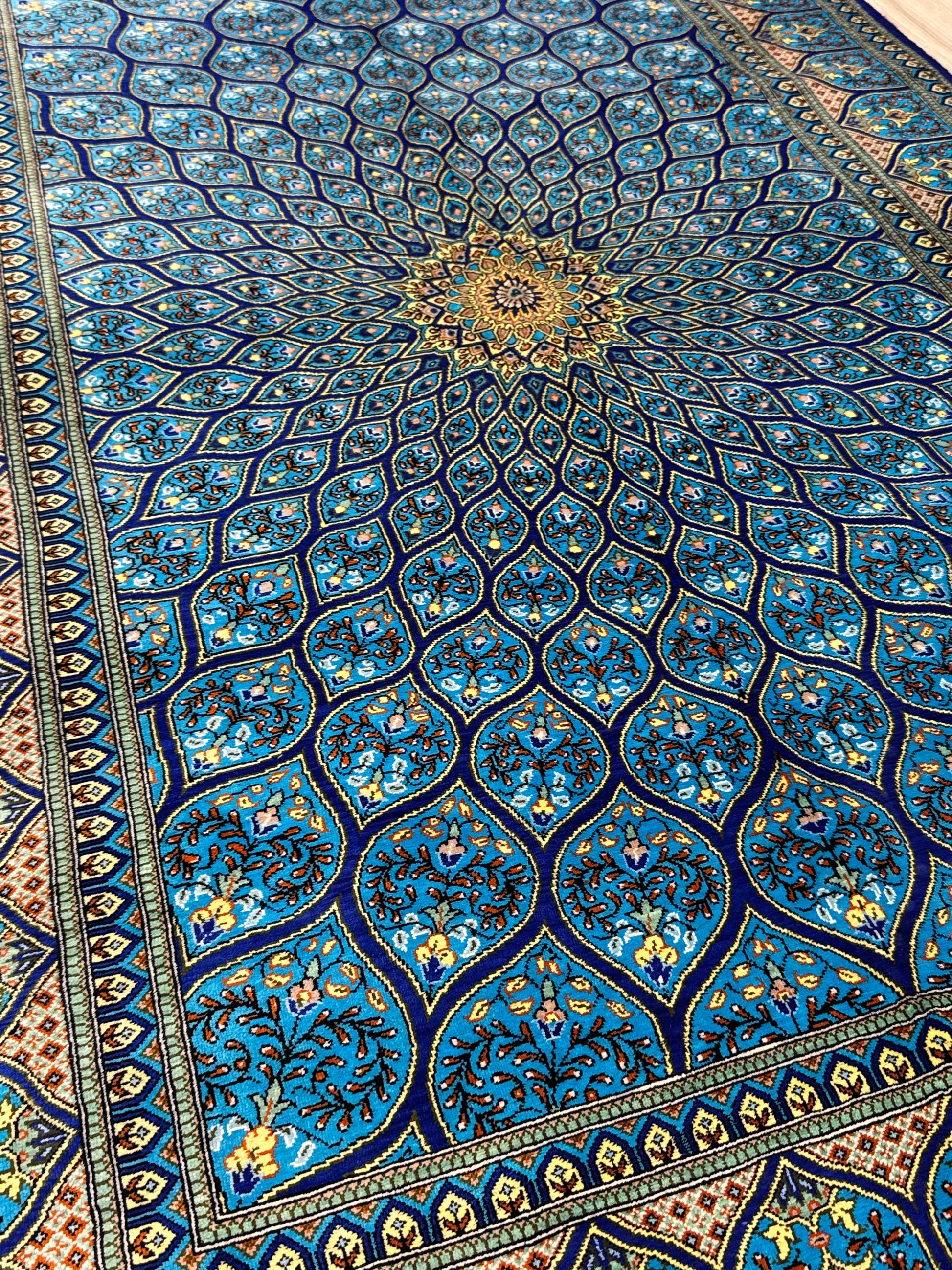Woven with masterful precision and dyed using natural plant-based pigments, hues of midnight blue, ivory, and gold shimmer with refined brilliance. A poetic tribute to spiritual harmony and timeless craftsmanship, this piece brings depth, stillness, and celestial beauty to any refined space.
