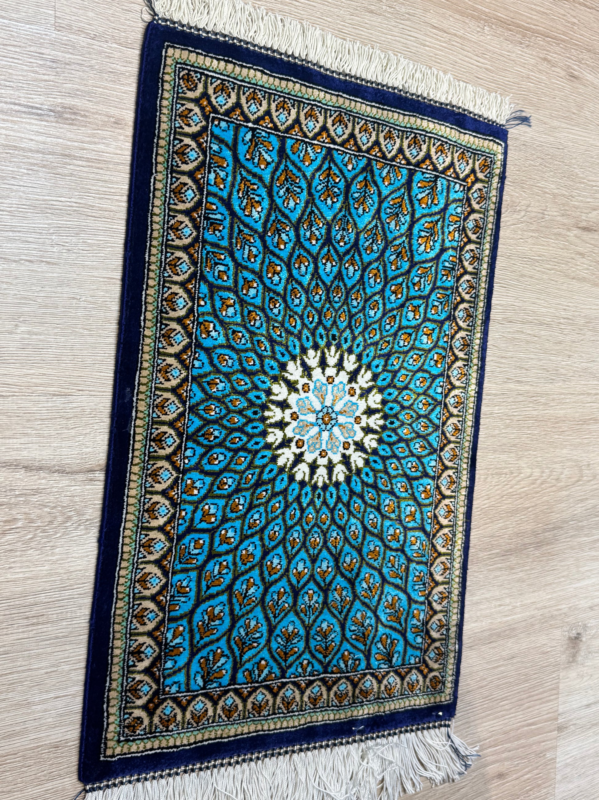 Crafted with fine silk threads and enriched by natural plant-based dyes, tones of sapphire blue, soft ivory, and antique gold shimmer with quiet elegance. A timeless tribute to cosmic balance and artisanal mastery, this piece brings depth, serenity, and celestial beauty to any refined setting.