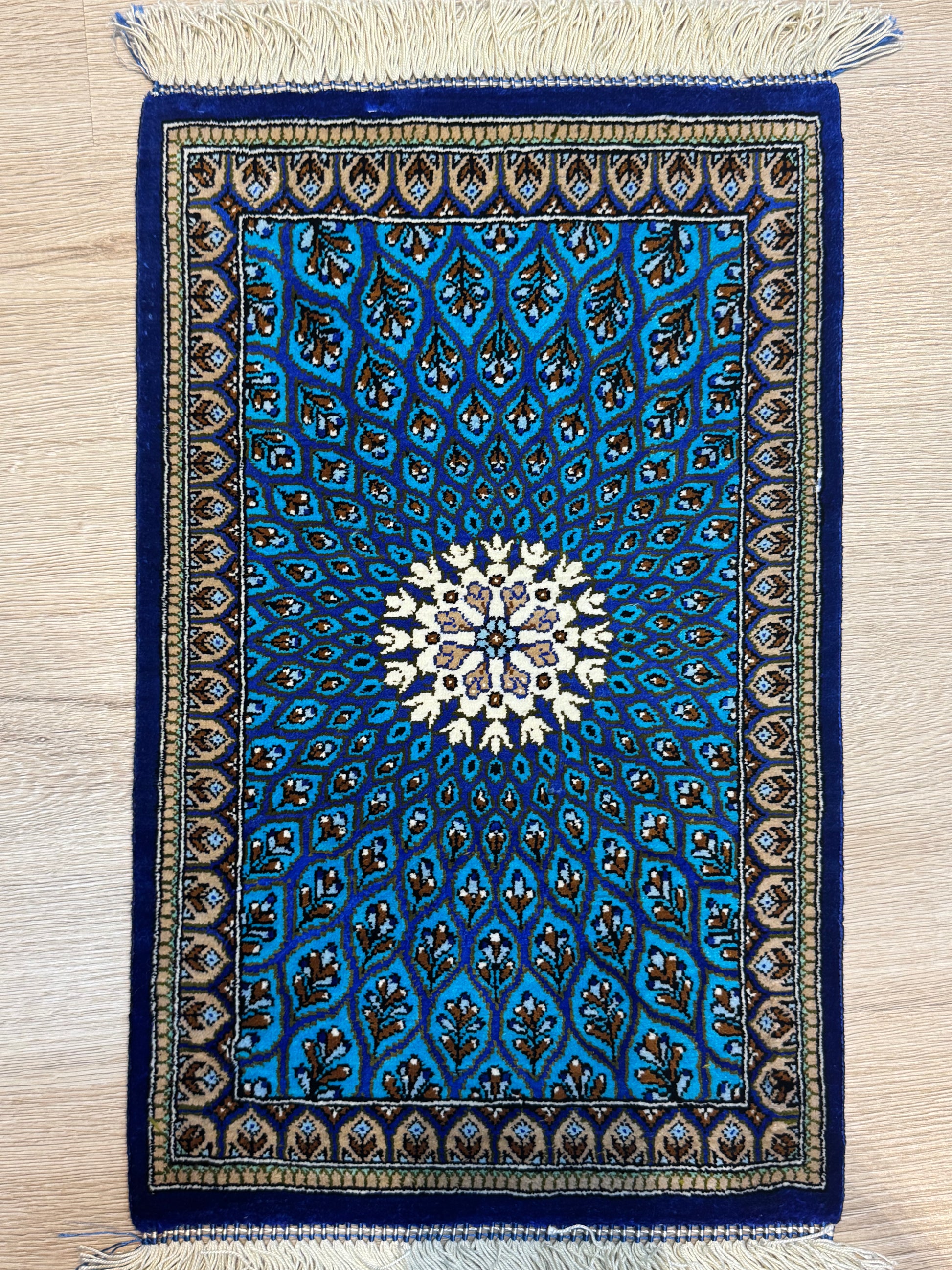 Inspired by the timeless geometry of starlit architecture, this silk rug unfolds like a celestial vault rendered in thread. A luminous medallion anchors its heart, with symmetrical patterns radiating outward, echoing the divine order of ancient domes.