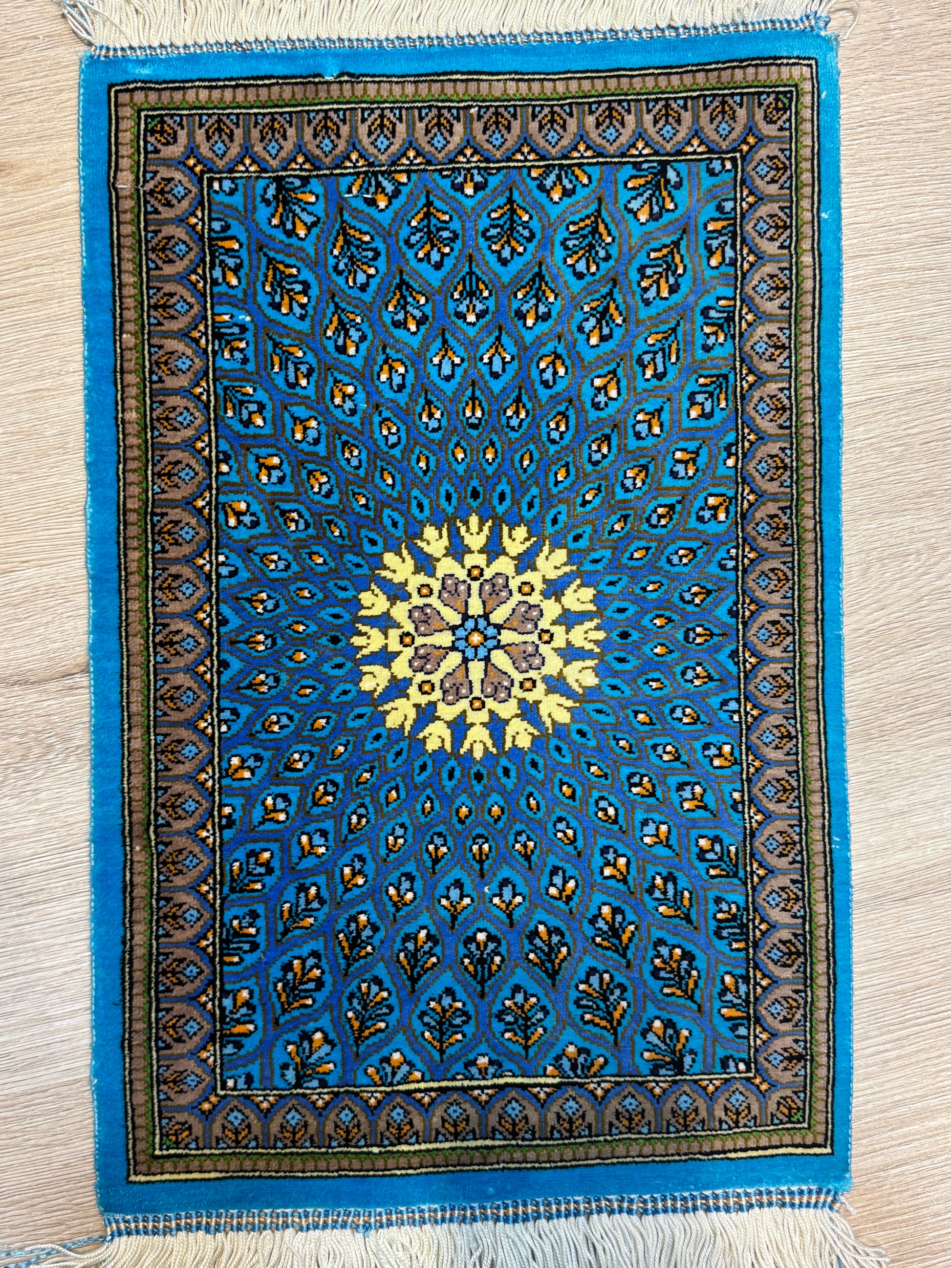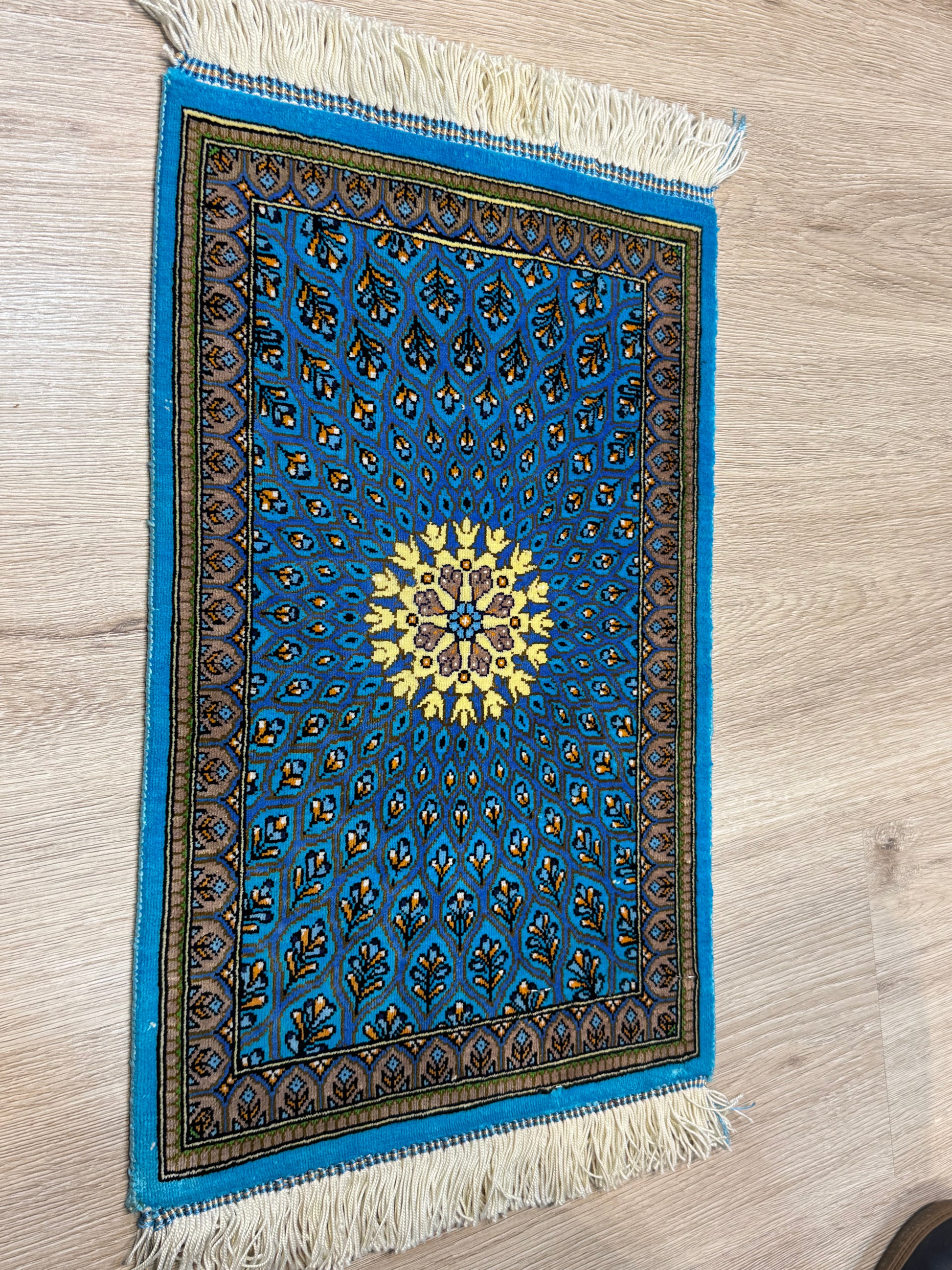 Woven with fine silk threads and enriched by natural plant-based dyes, hues of sapphire blue, soft ivory, and golden amber glow with quiet majesty. A timeless tribute to cosmic grace and artisanal mastery, this piece brings depth, serenity, and spiritual elegance to any refined interior.