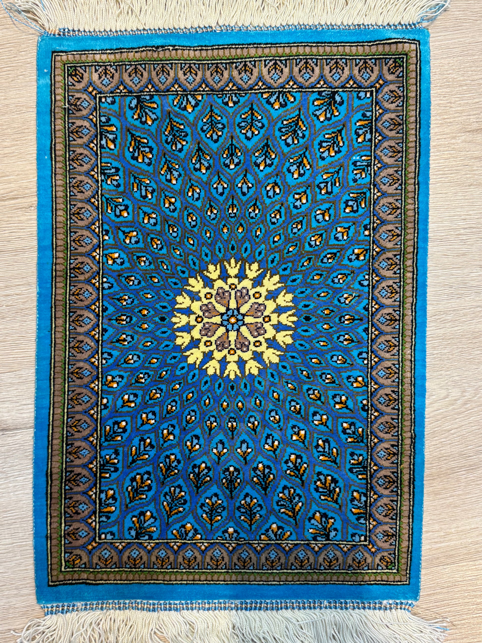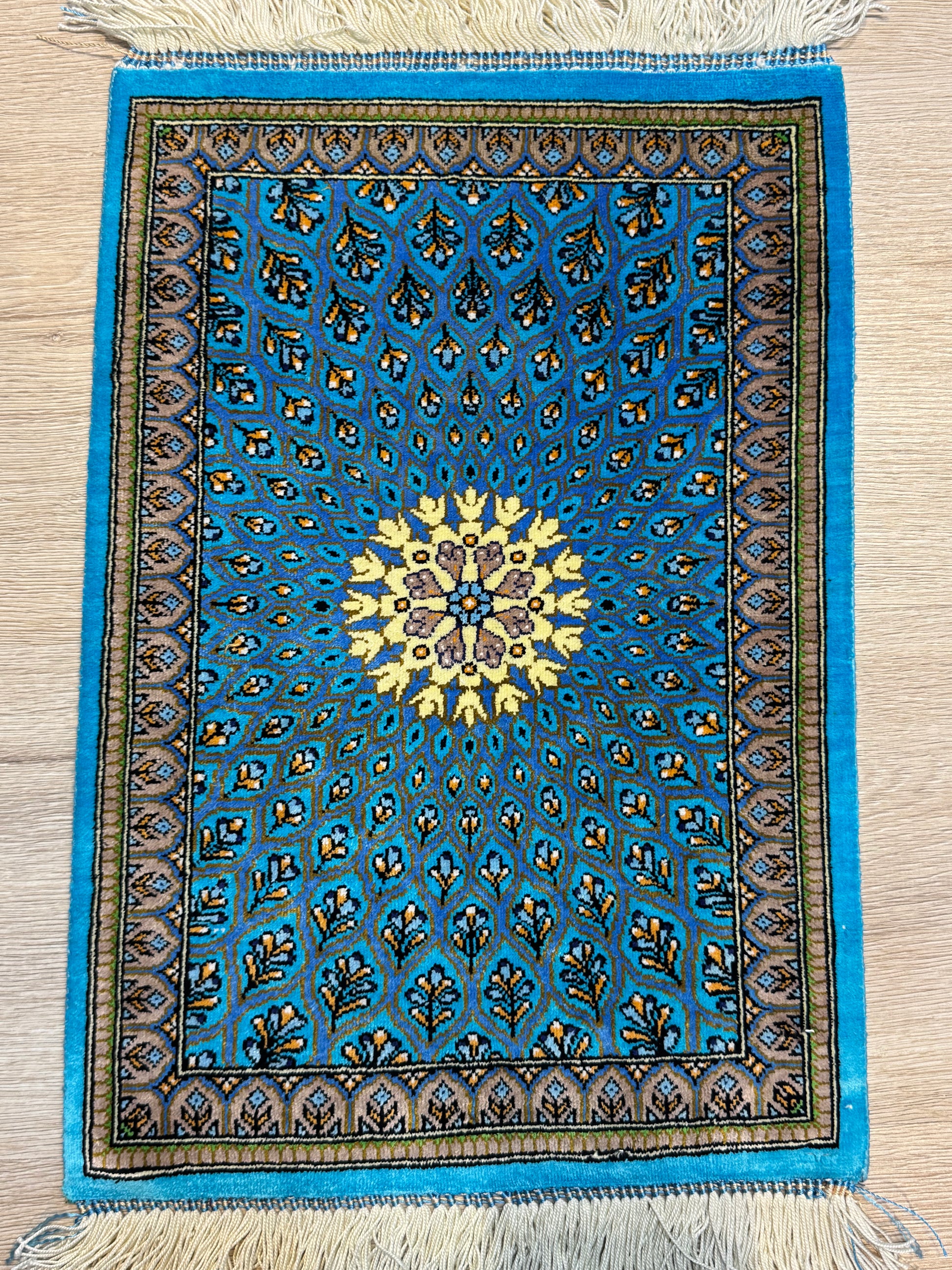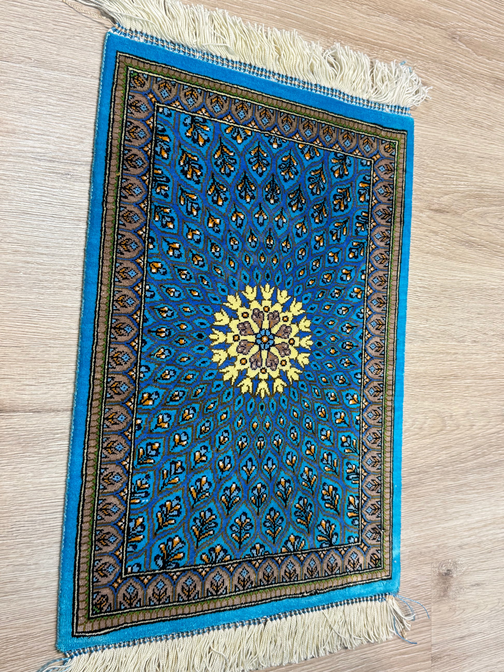 Crafted with fine silk threads and enriched by natural plant-based dyes, tones of deep indigo, moonlit ivory, and soft gold shimmer with timeless grace. A poetic tribute to cosmic order and refined craftsmanship, this piece brings spiritual beauty and quiet elegance to any space.