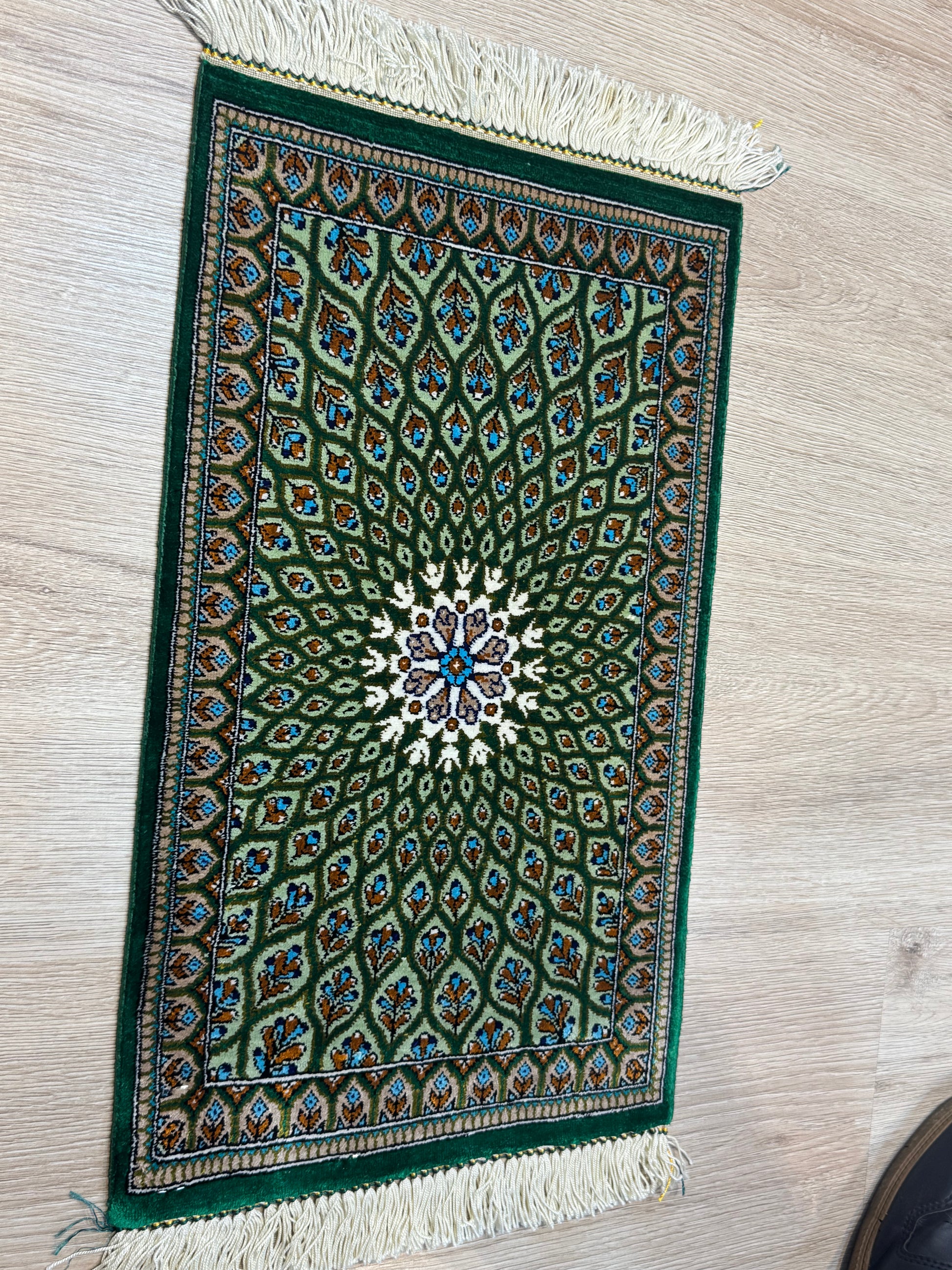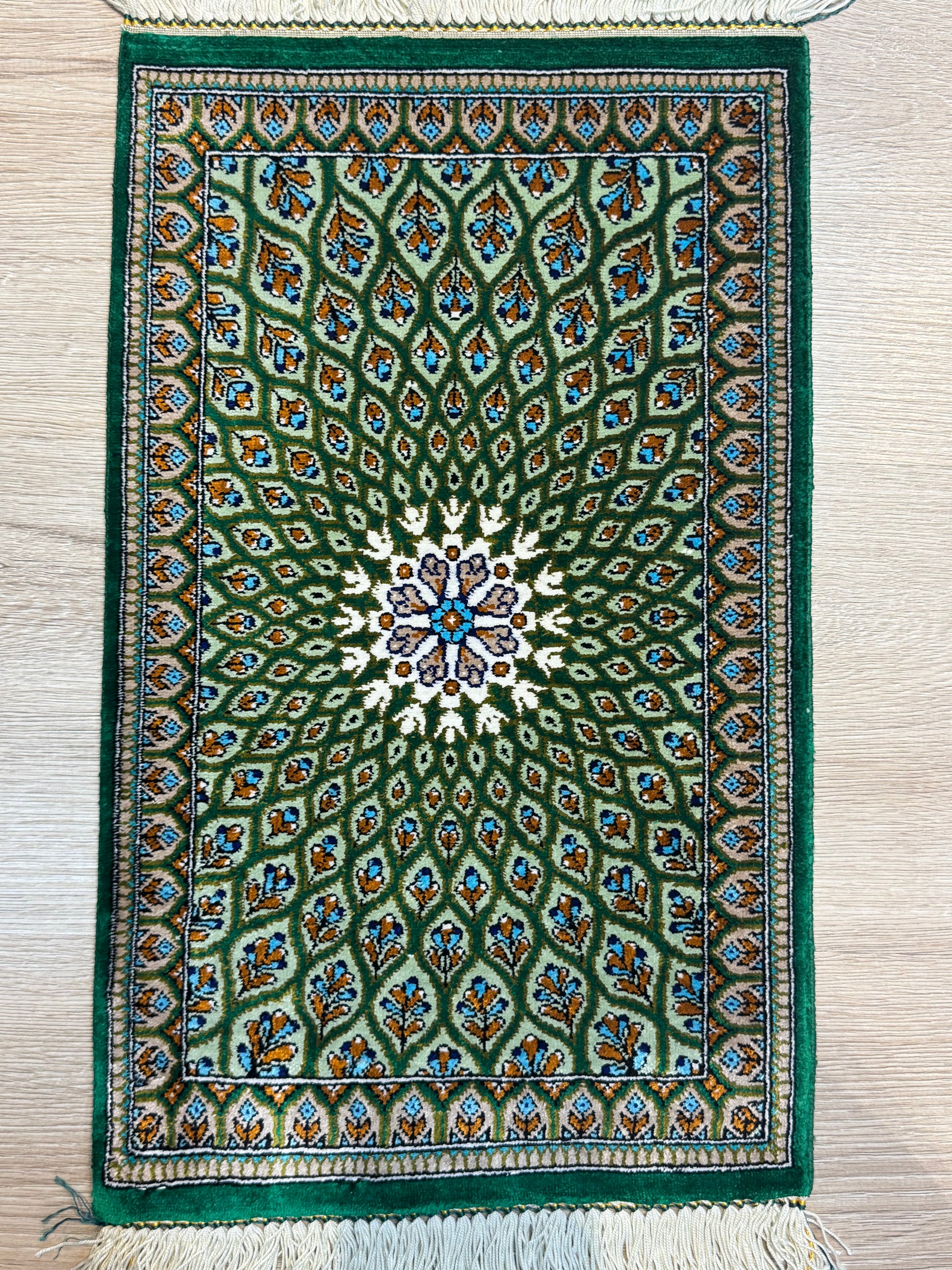 Drawing from the grandeur of ancient skyward architecture, this silk rug reflects the harmony and precision of celestial domes. A radiant medallion unfolds from a luminous core, its layered geometry echoing the starlit ceilings of sacred halls.