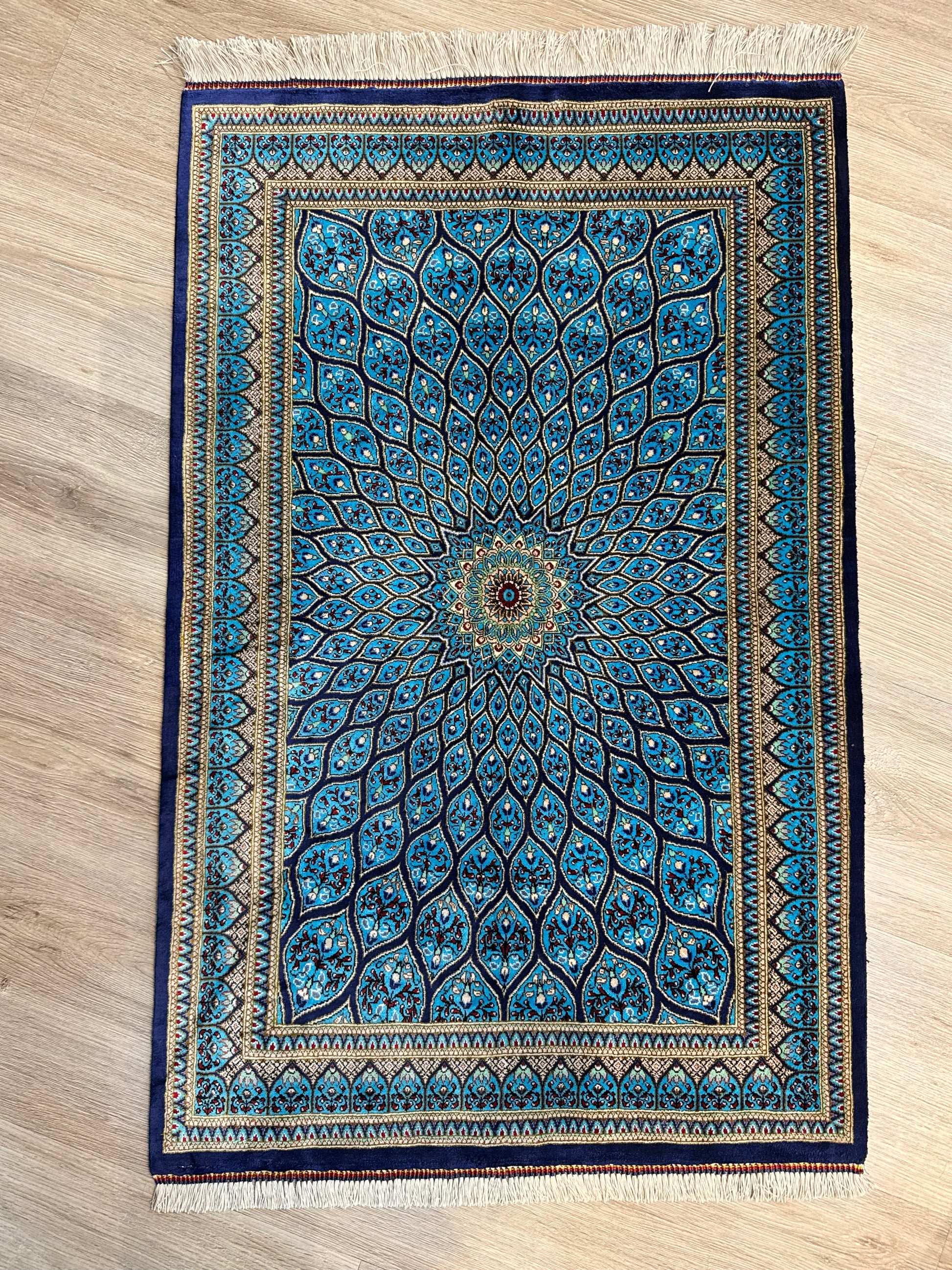 Drawing inspiration from the celestial architecture of ancient domes, this silk rug radiates with spiritual symmetry and cosmic elegance. A luminous medallion at its heart anchors a constellation of intricate patterns, echoing the star-mapped ceilings of sacred halls.