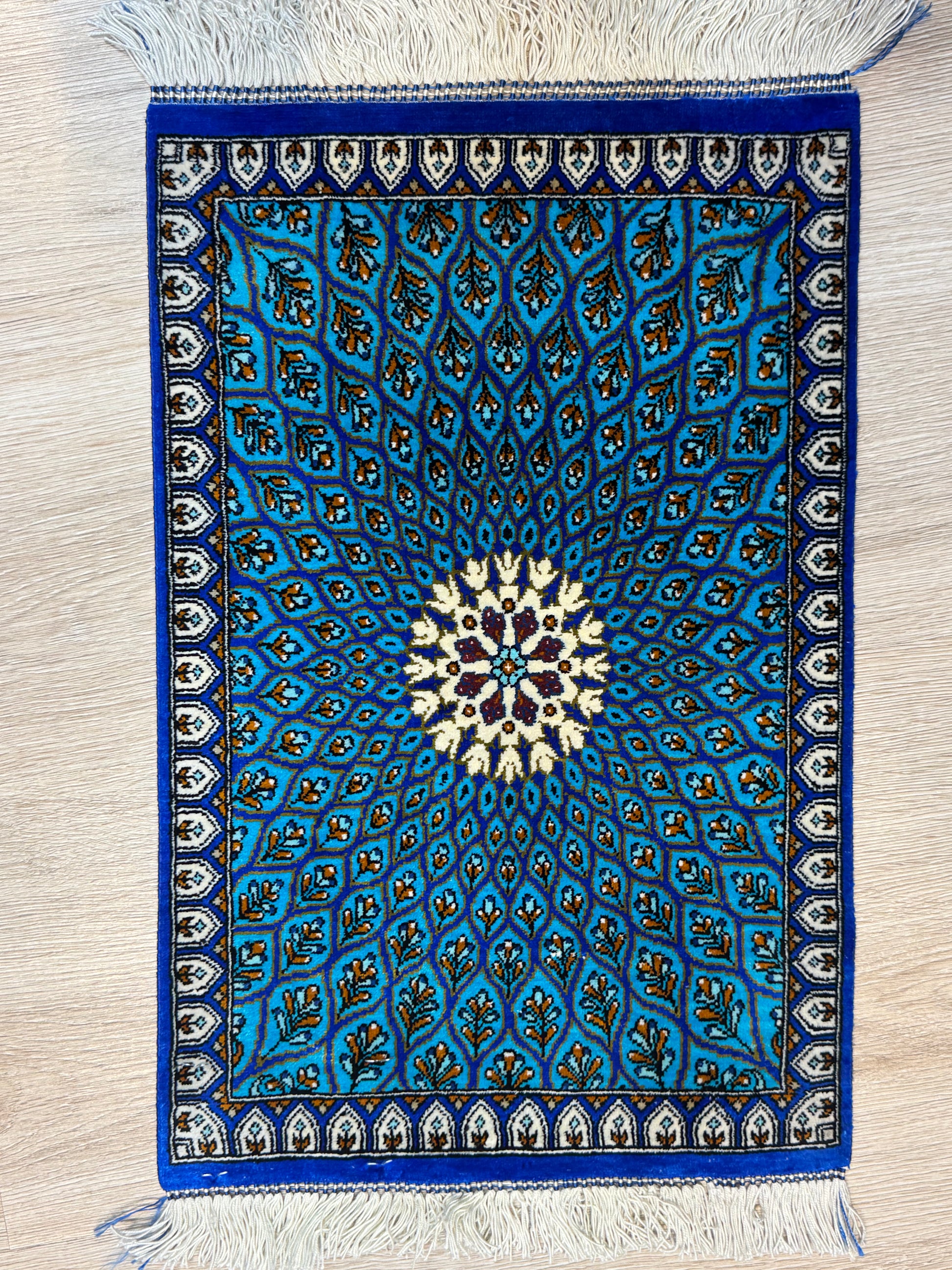 Inspired by the celestial domes of ancient architecture, this silk rug unveils a vision of cosmic harmony and sacred symmetry. From a luminous core, intricate patterns radiate outward like a constellation, echoing the balance of sky-bound sanctuaries.