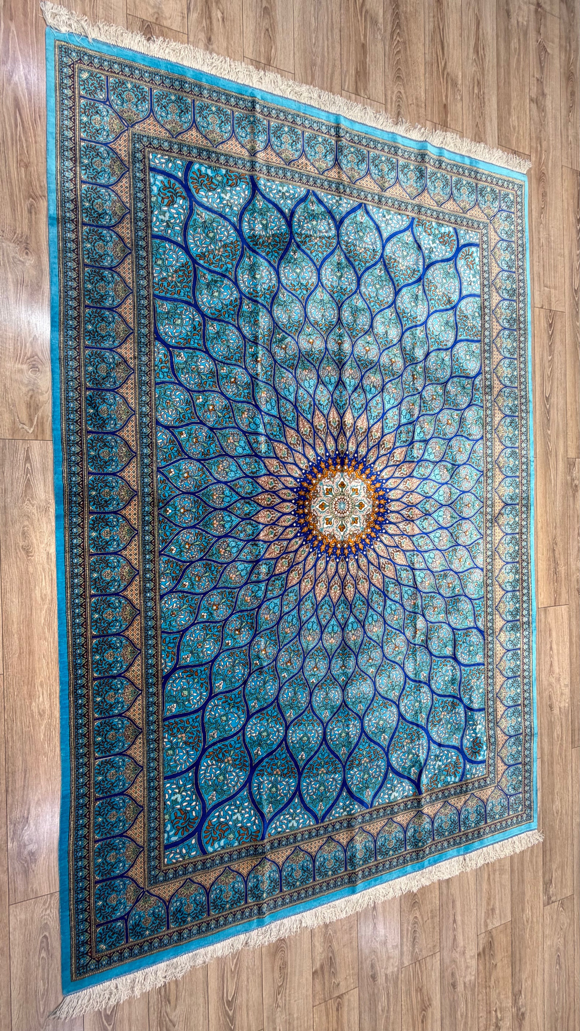 Inspired by the vaulted ceilings of ancient observatories and sacred halls, this silk rug mirrors the ordered beauty of the cosmos. Its handwoven lattice radiates from a glowing center, unfolding in perfect symmetry like a constellation in silk. Shades of midnight blue, ivory, and gold—dyed with natural plant-based pigments—create a luminous depth that shifts with the light. A quiet homage to celestial harmony and timeless design, this piece transforms any space into a sanctuary of elegance.