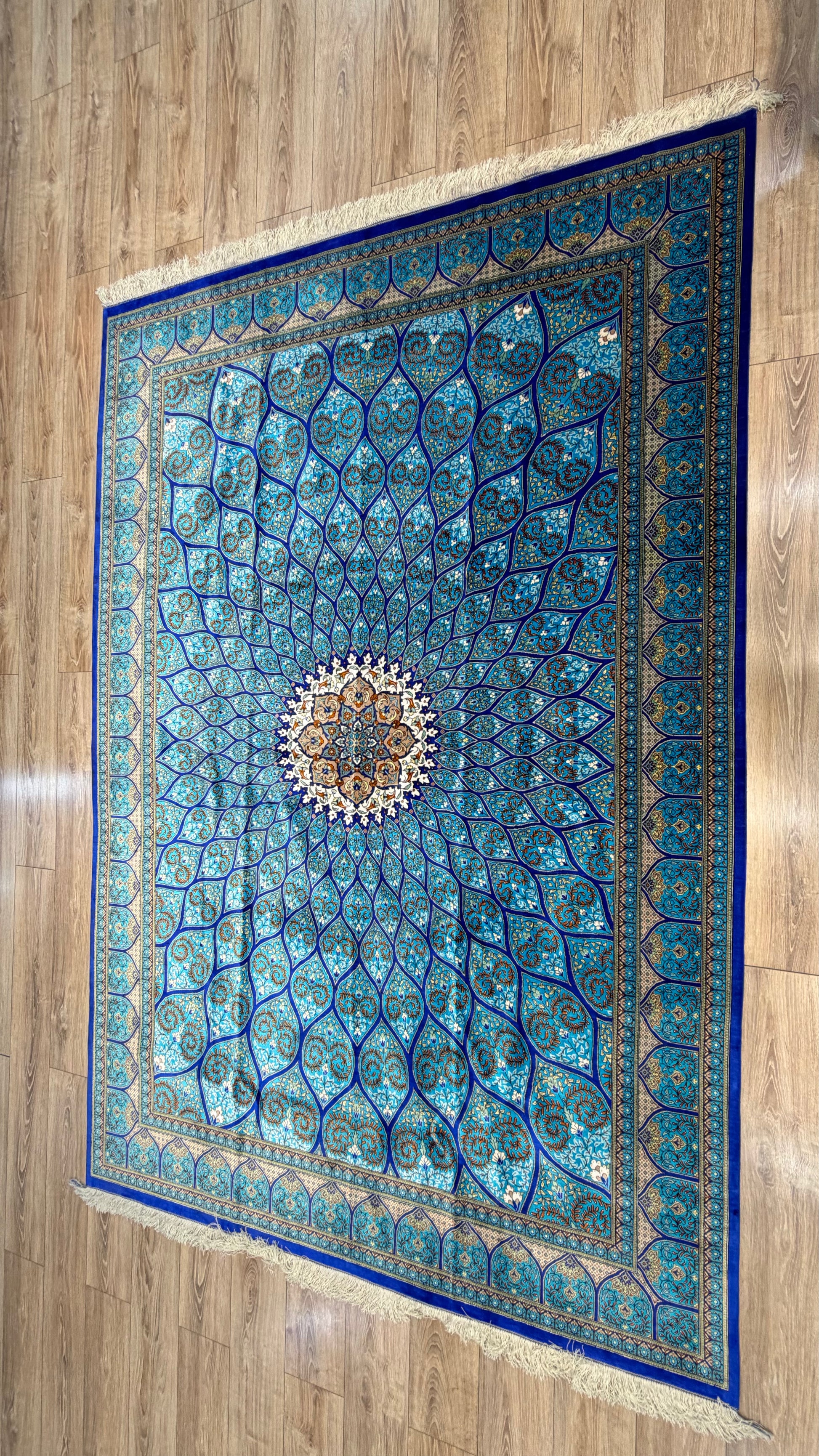 Drawing inspiration from the celestial architecture of ancient domes, this silk rug captures the serene order and mysticism of the heavens. A radiant medallion emerges from a luminous center, expanding outward in precise symmetry like a starburst woven in silk. Handcrafted with fine silk threads and colored using natural plant-based dyes, its tones of deep indigo, starlit gold, and soft ivory shimmer with quiet reverence. A timeless reflection of cosmic grace, this piece brings spiritual balance and refined beauty to any interior.