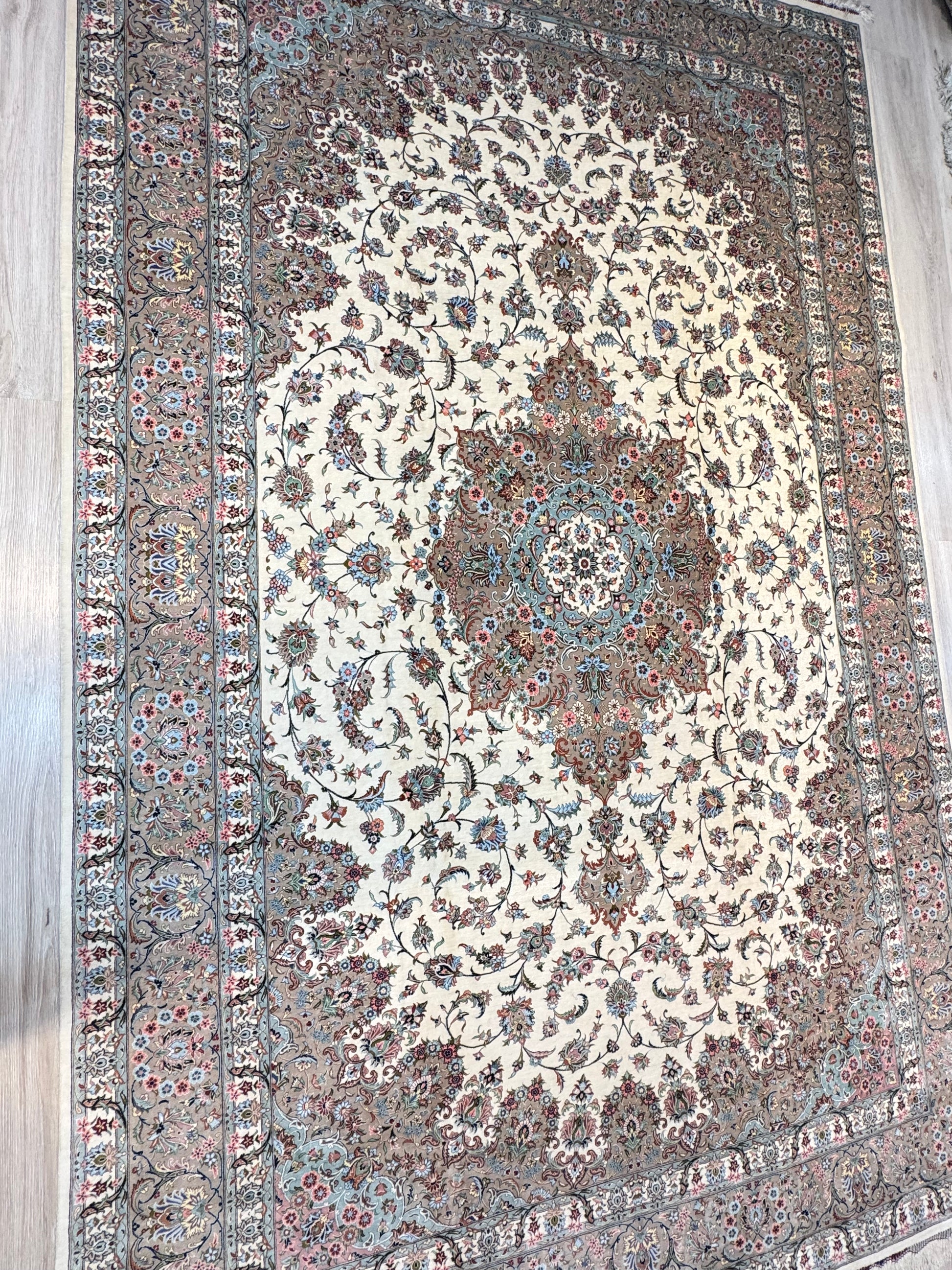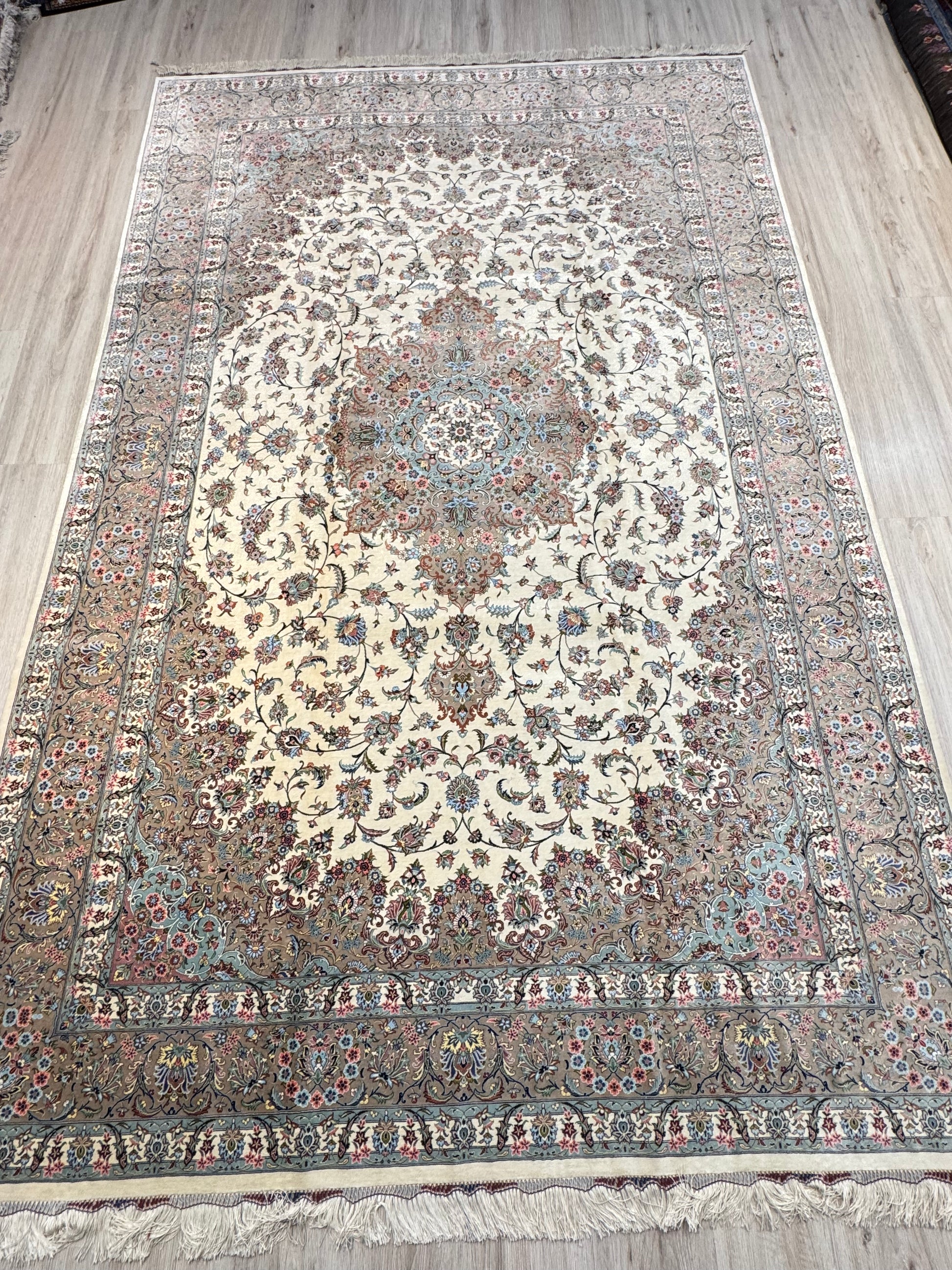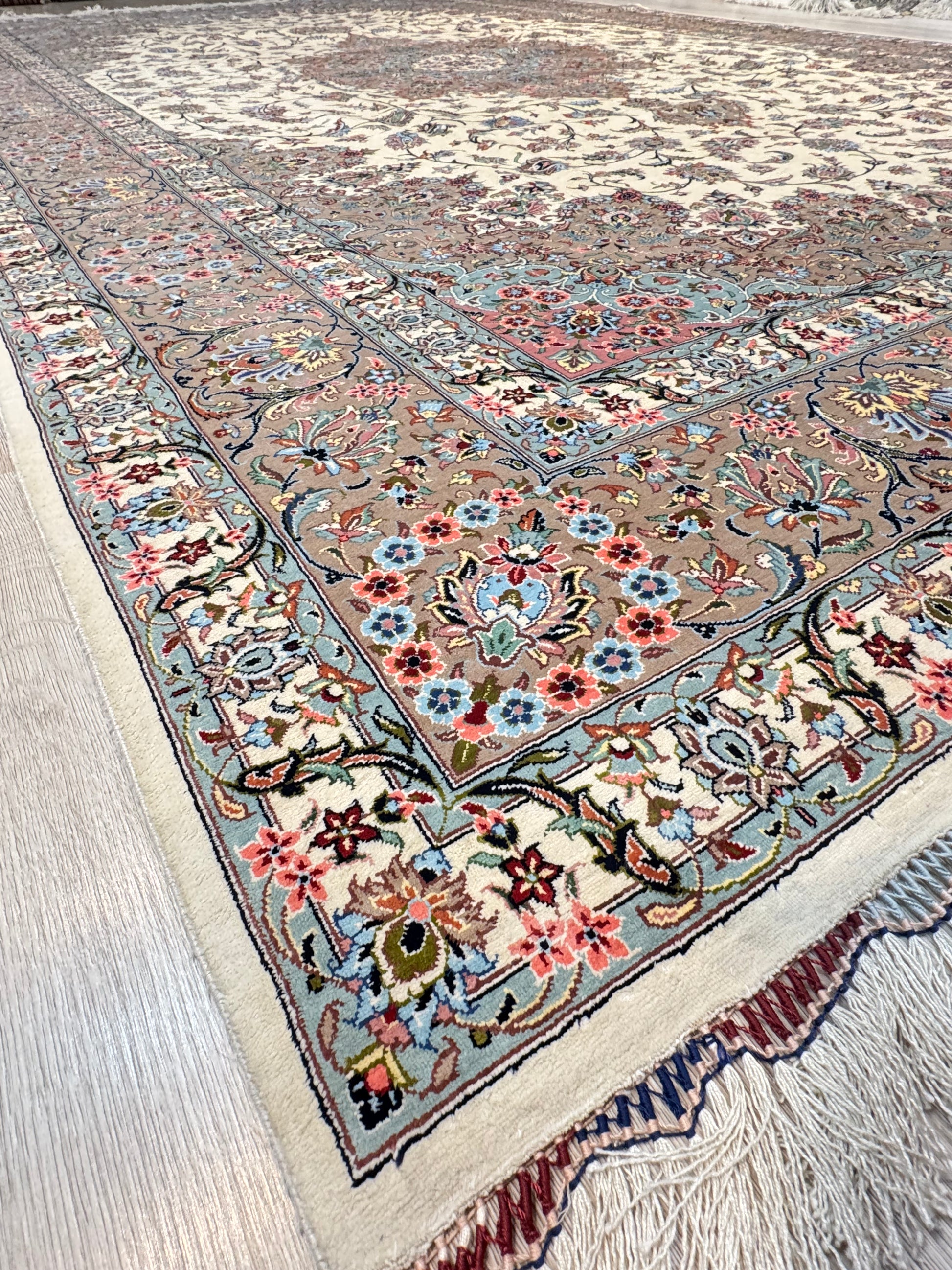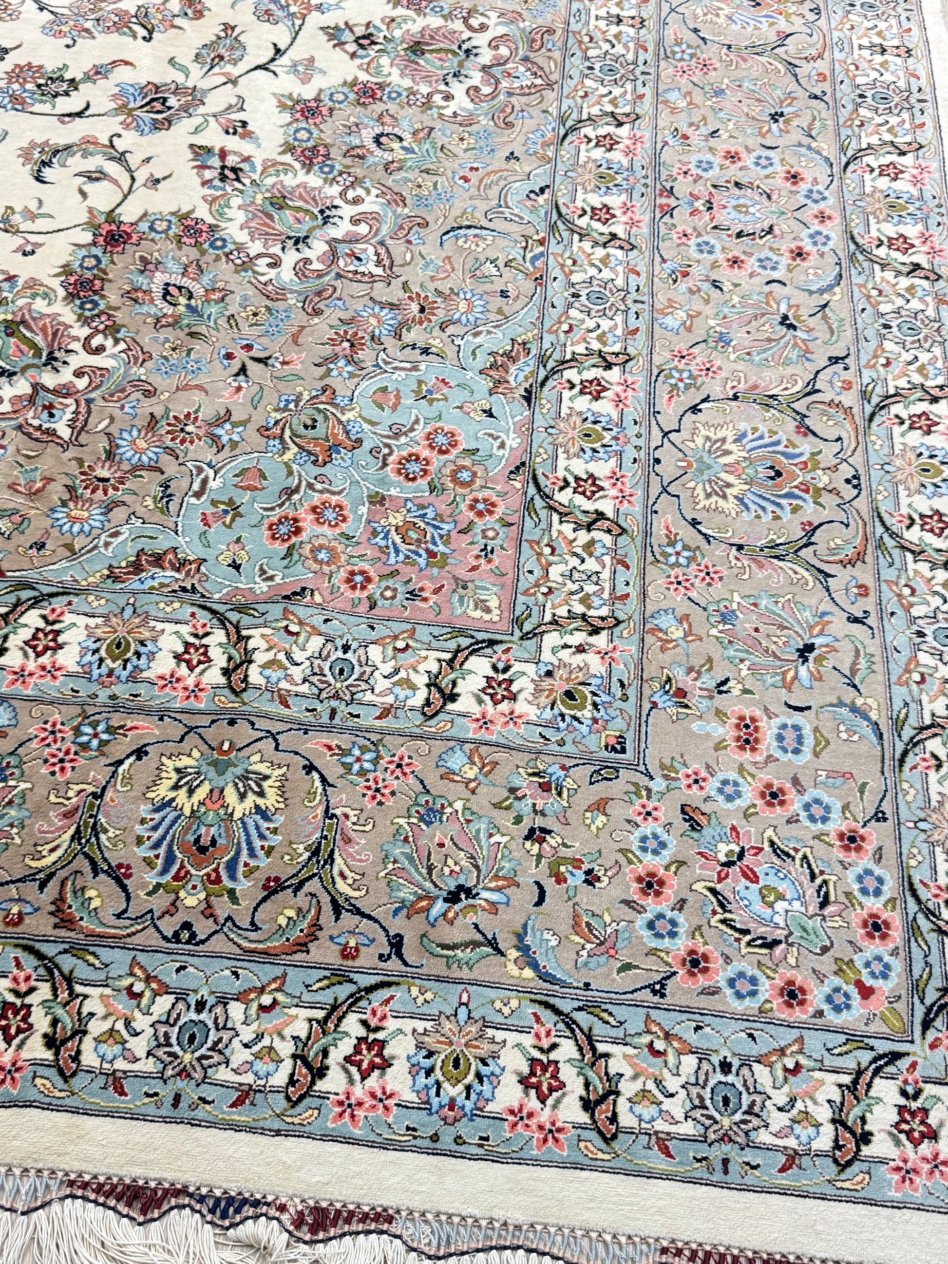 Drawing inspiration from the lush gardens and poetic tapestries of Persian tradition, this silk rug blossoms with delicate floral geometry and timeless elegance. A graceful medallion anchors the composition, from which vines, blossoms, and arabesques unfurl in a harmonious dance. Handwoven from the finest silk threads and tinted with natural plant-based dyes, its soft hues of rose, jade, and ivory glow with refined serenity. A dream woven in silk, this piece embodies the beauty, balance, and lyrical spirit of Persian artistry.
