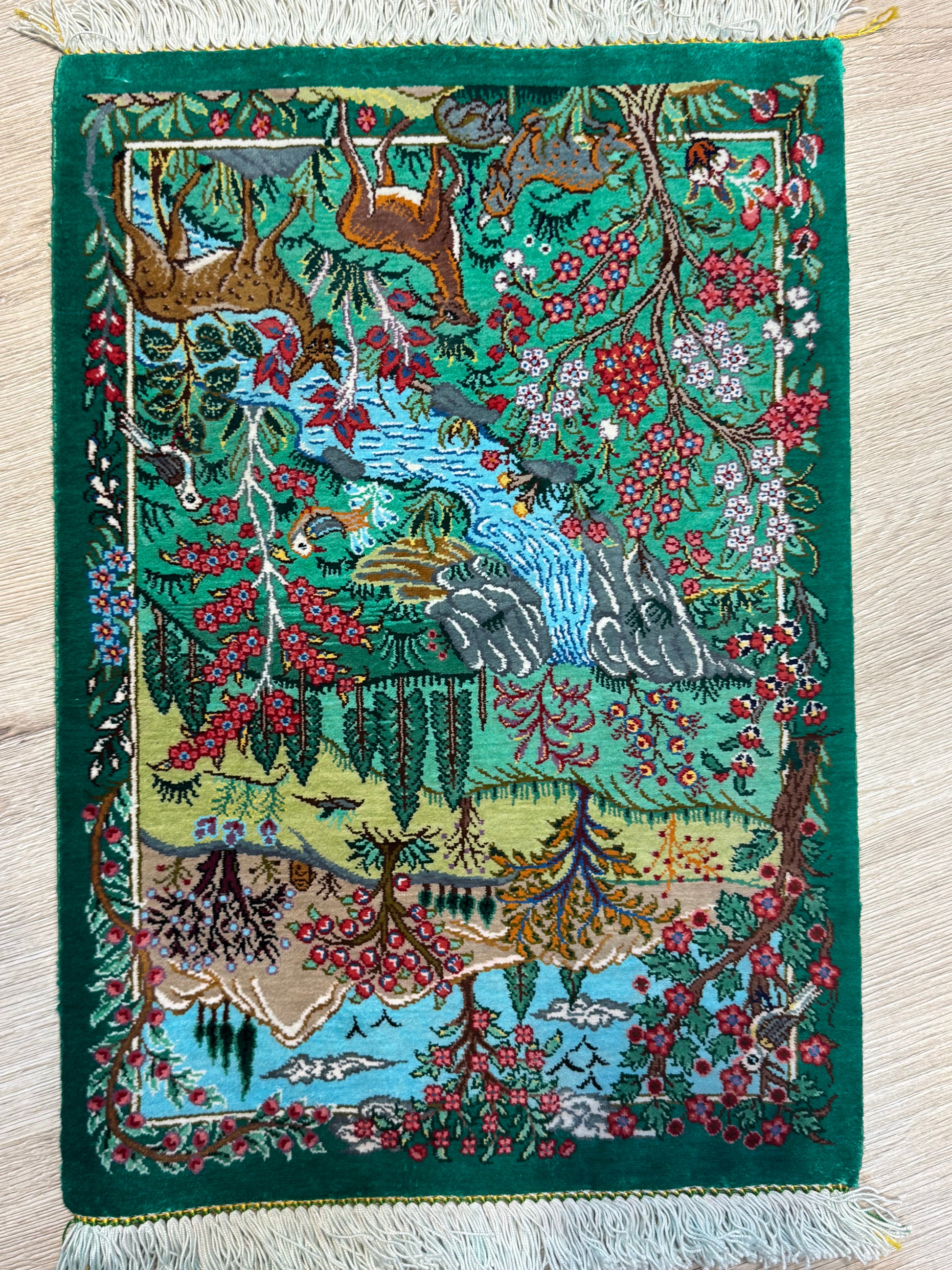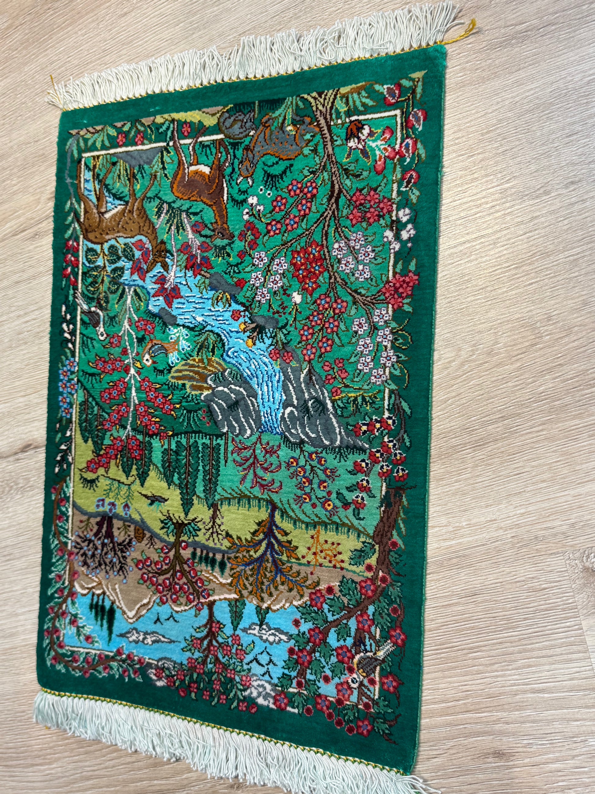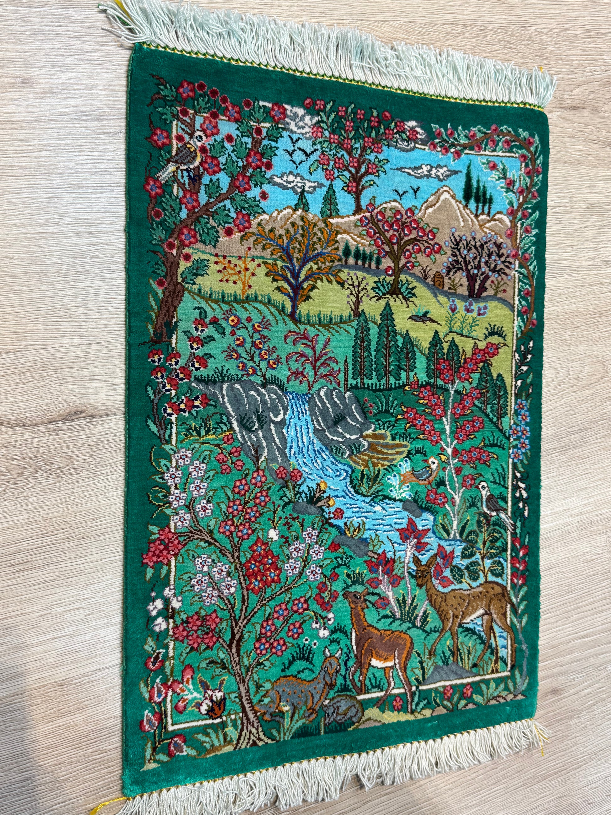 Woven with luxurious silk threads and enriched by natural plant-based dyes, tones of soft jade, blush rose, and ivory shimmer with quiet radiance. A poetic tribute to peace and refinement, this piece brings the essence of heaven gently into your living space.