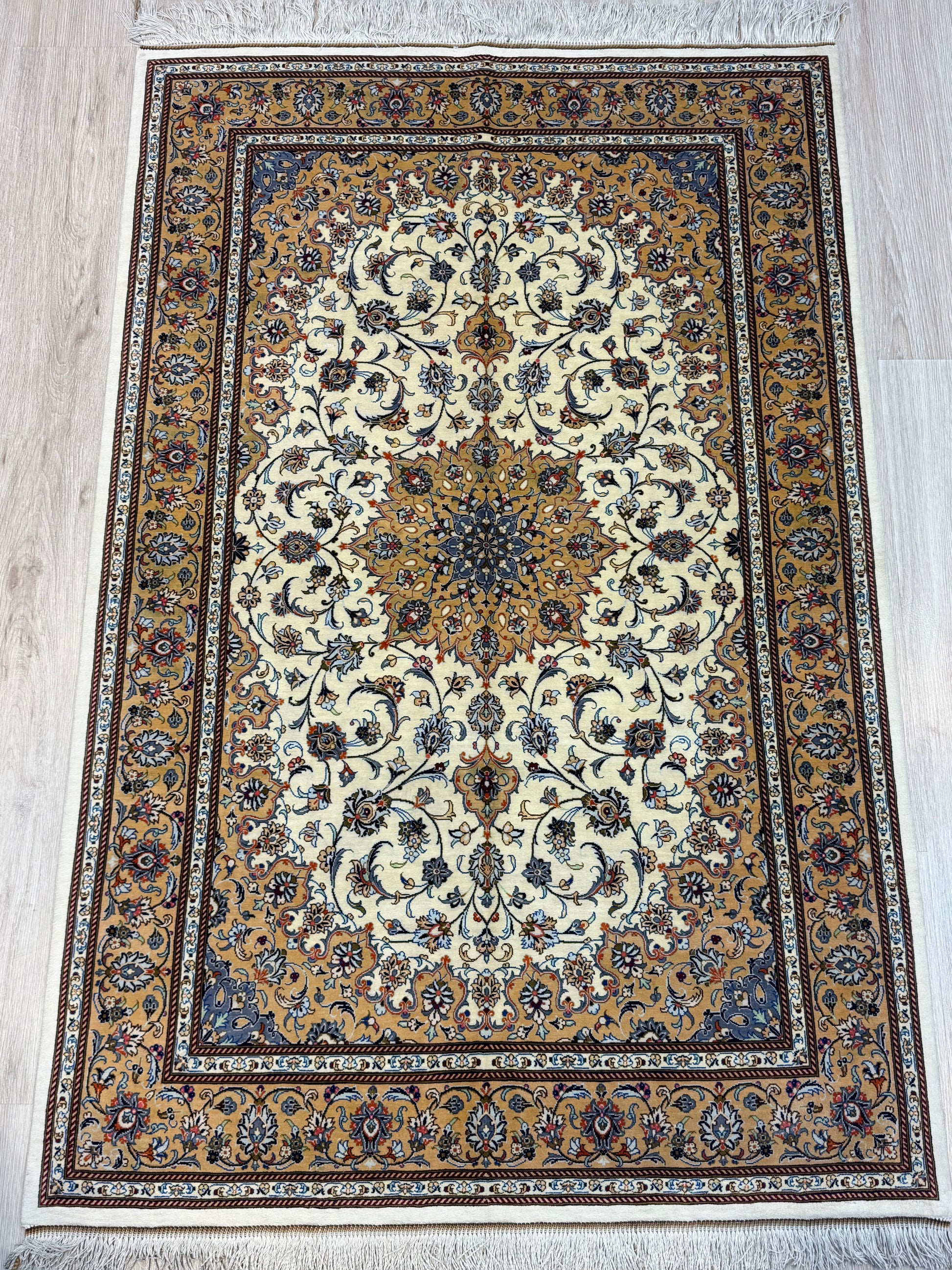 Drawing from the refined legacy of Persian imperial design, this silk rug weaves together intricate arabesques, floral scrolls, and harmonious geometry. At its heart lies a radiant medallion, unfolding with regal symmetry reminiscent of palace artistry and ancient tradition.