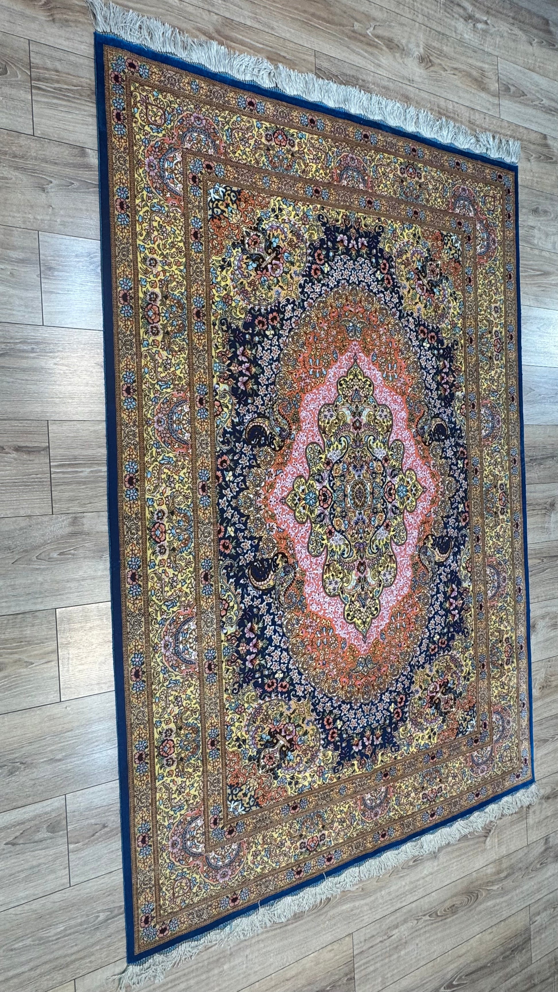 Drawing inspiration from the mystical intricacies of Eastern ornamentation, the Nayrang Medallion pattern reveals a captivating fusion of color, rhythm, and sacred geometry. At its center, a radiant medallion unfolds like a spellbound mosaic, its layers echoing with depth and symbolic grace. Woven from fine silk threads and tinted with natural plant-based dyes, the rich interplay of lapis blue, amber, and soft ivory creates a shimmering, enchanted effect. A masterwork of visual poetry and ancient charm, this rug invites both wonder and reverence into any refined space.