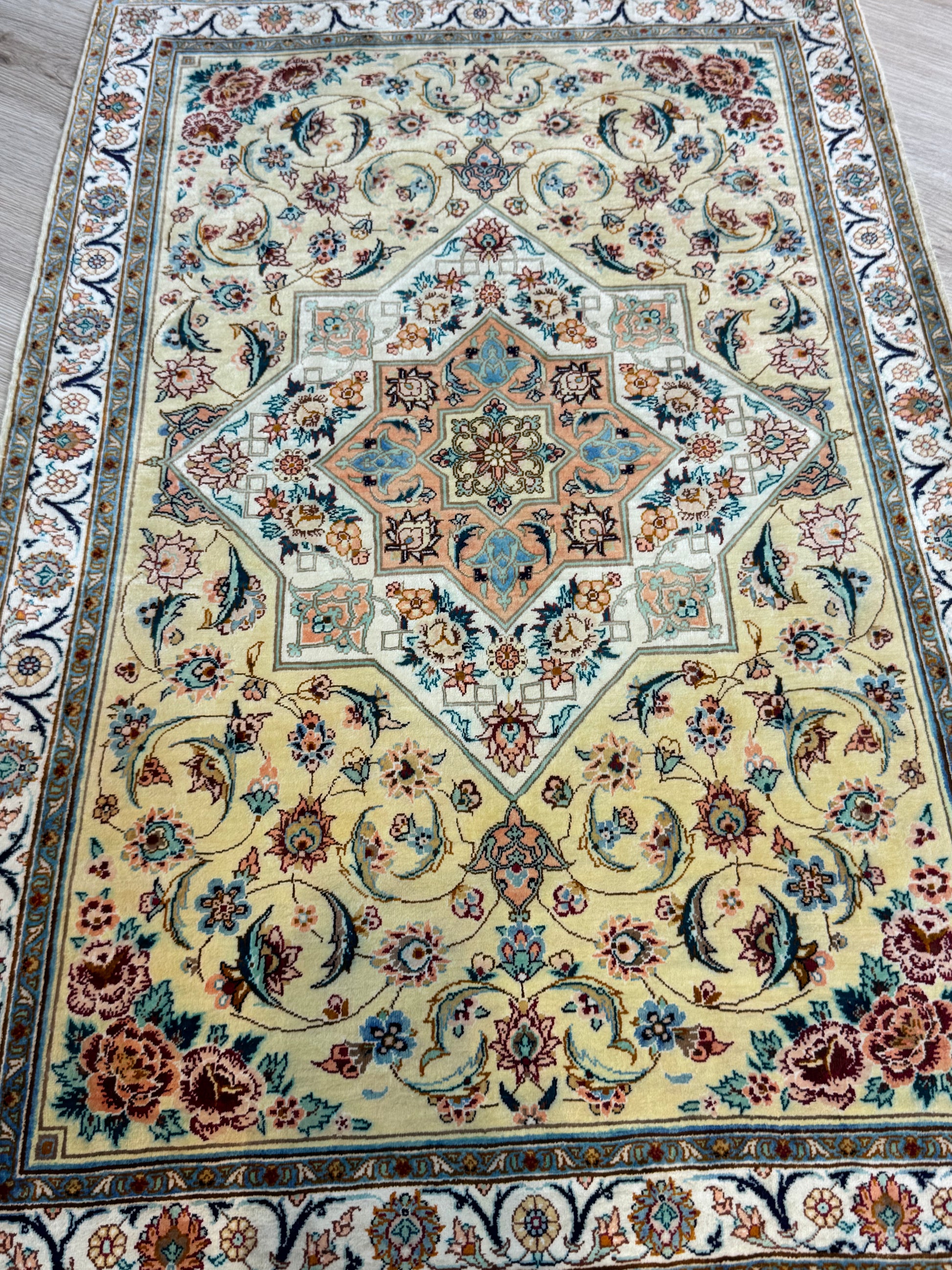 Inspired by the storied crossroads of Samarkand, this silk rug weaves together motifs from East and West in a dance of refined symmetry and cultural richness. A luminous medallion anchors the composition, framed by intricate borders and floral arabesques that echo the city’s mosaic heritage.