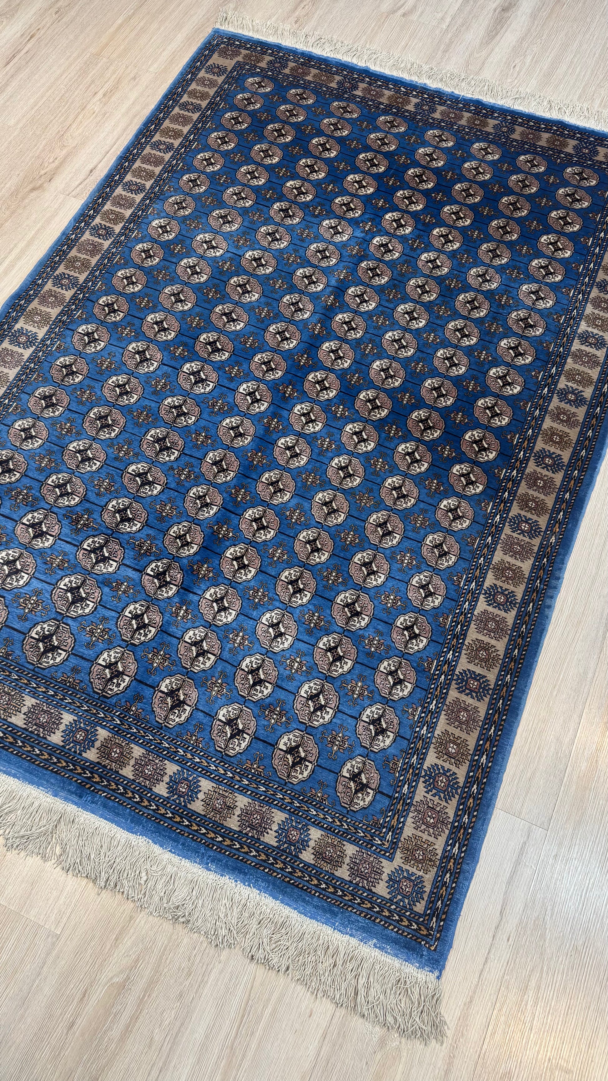 Drawing inspiration from the revered Tekke traditions of Bukhara, this silk rug celebrates the precision and power of tribal geometry. Its bold, symmetrical medallions emerge from a sacred axis, evoking the protective spirit and rhythm of ancestral weavings. Meticulously crafted with fine silk threads and enriched by natural plant-based dyes, its deep hues of crimson, ivory, and umber carry a quiet strength. A testament to cultural legacy and artisan mastery, this piece brings the enduring soul of Central Asia into the modern interior.