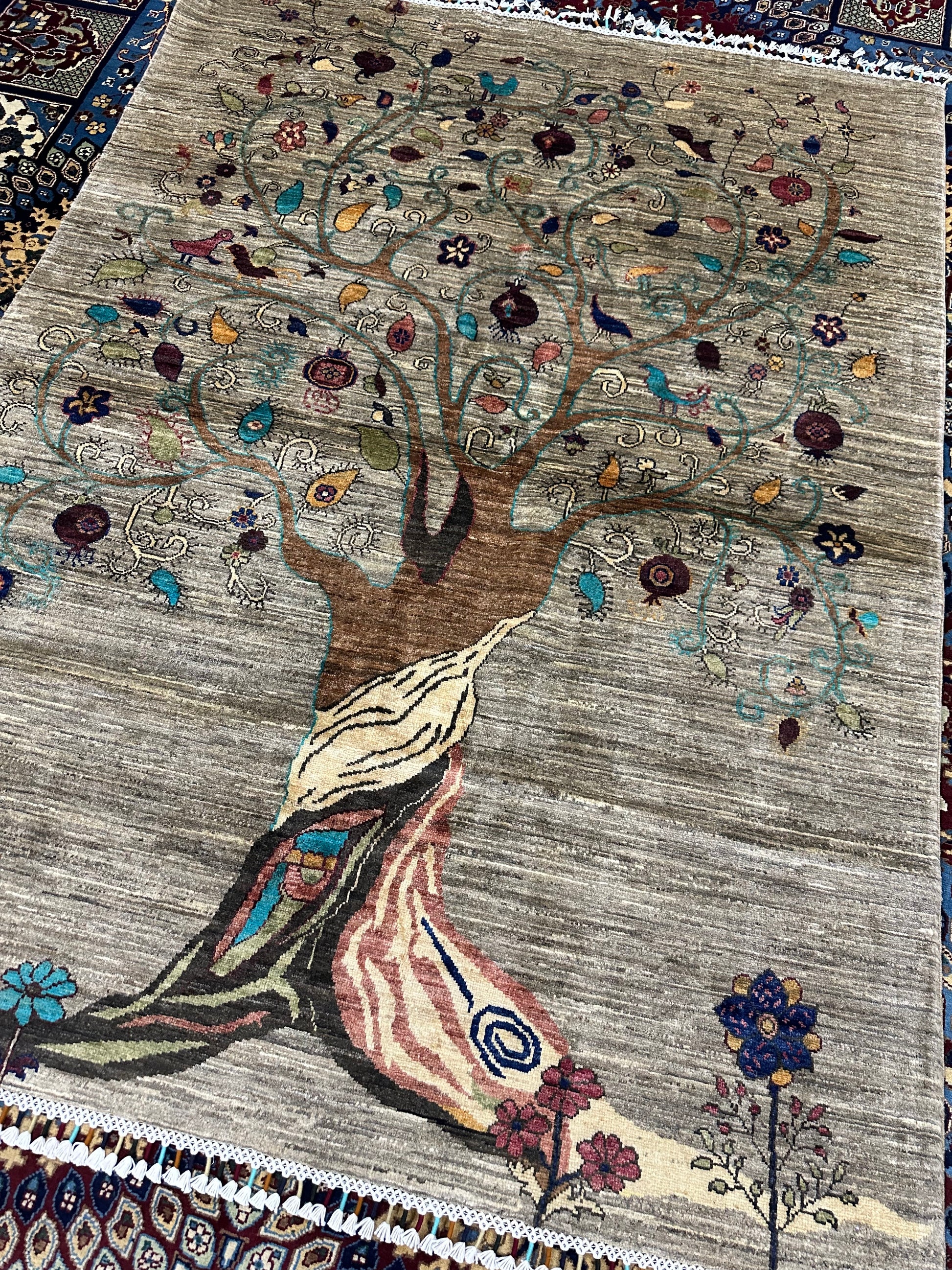Drawing inspiration from mythical orchards and the abundance of paradise, this silk rug reveals a lush tree motif adorned with radiant ruby-like fruits. Rising from a sacred center, its branches stretch outward in balanced harmony, each leaf and pomegranate rendered with delicate precision. Handwoven with fine silk threads and enriched by natural plant-based dyes, its rich tones of crimson, emerald, and antique gold shimmer with life and symbolism. A celebration of fertility, beauty, and ancient tradition, this piece brings a sense of wonder and timeless opulence to any space.