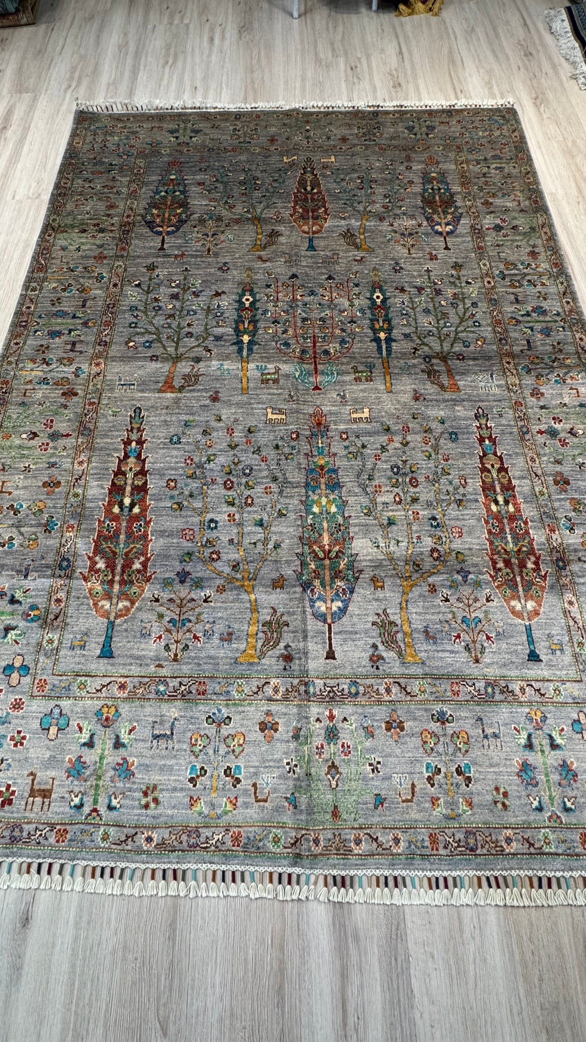 Inspired by the timeless stillness of forest sanctuaries, this silk rug captures the quiet dialogue of trees swaying in harmony. From a calm, centered heart, slender trunks and leaf-laced branches extend in flowing symmetry, echoing nature’s silent rhythm. Handwoven with fine silk threads and dyed with natural plant-based pigments, its tones of woodland green, soft beige, and earthy brown create a gentle, grounding presence. A tribute to serenity and natural grace, this piece brings the soul of a tranquil grove into your home.