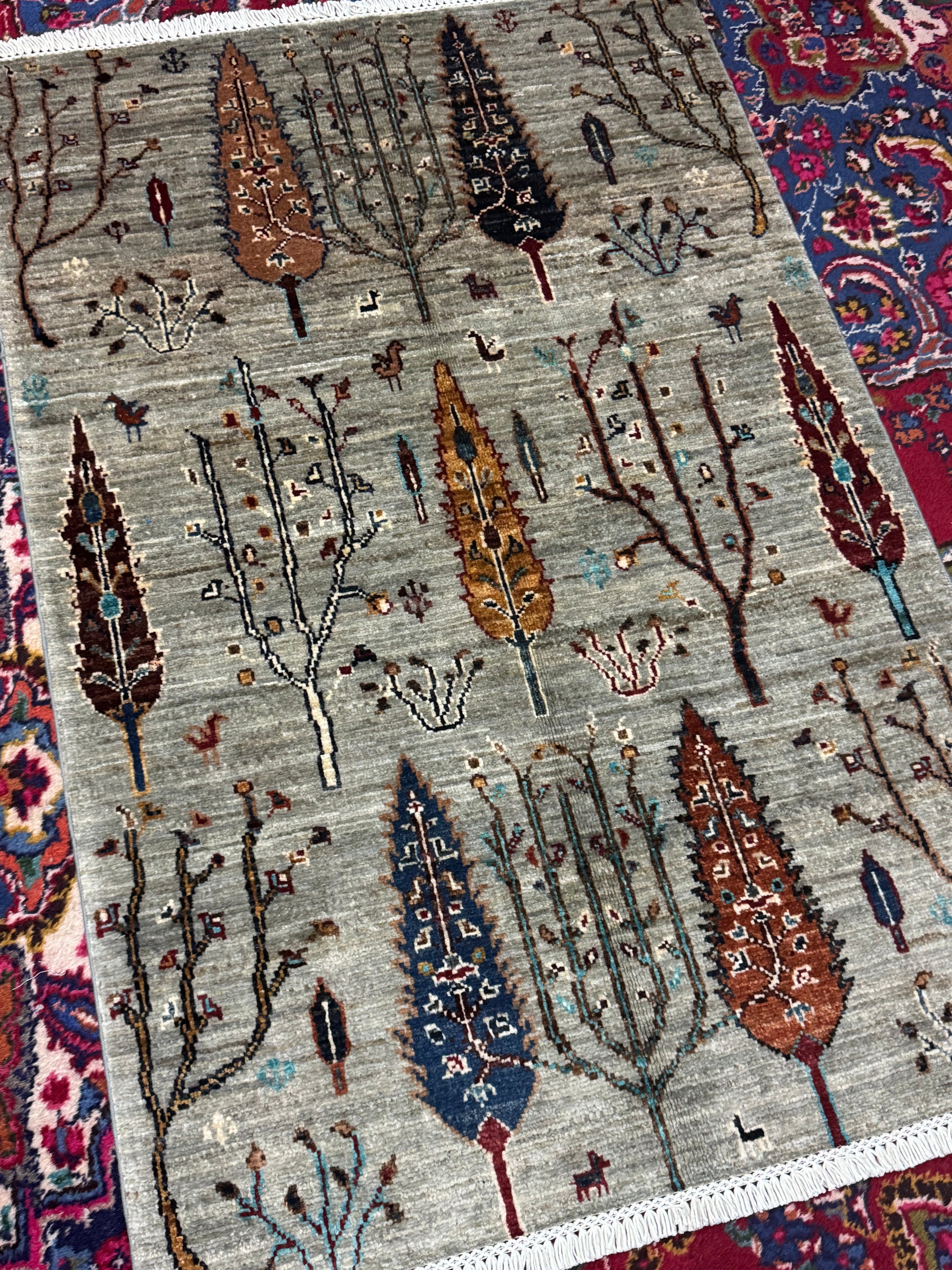 Inspired by the tranquil poetry of nature, this handwoven wool rug captures a grove where branches arch and leaves seem to murmur in the breeze. Delicate arboreal motifs extend in graceful symmetry, their fine lines and soft curves evoking both stillness and life. Crafted with time-honored skill and enriched by natural plant-based dyes, shades of moss green, warm earth, and golden light create a serene depth. A gentle tribute to nature’s voice, this piece brings quiet elegance and organic harmony to any space.